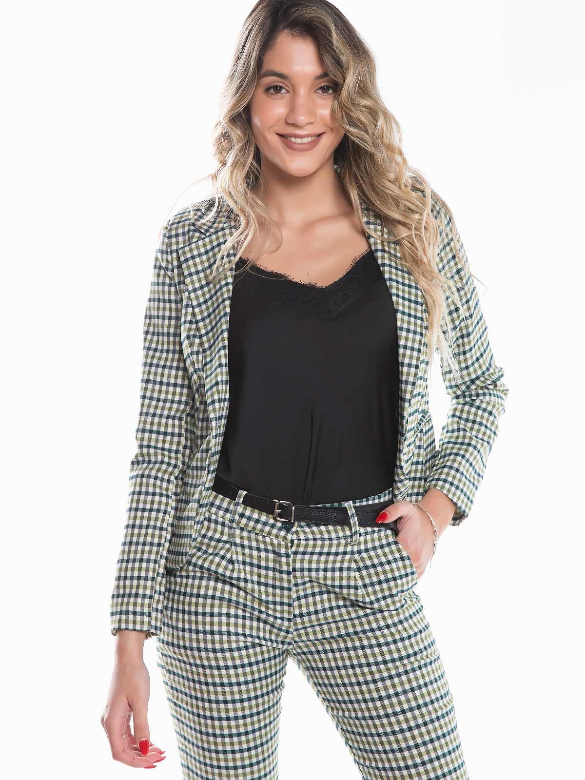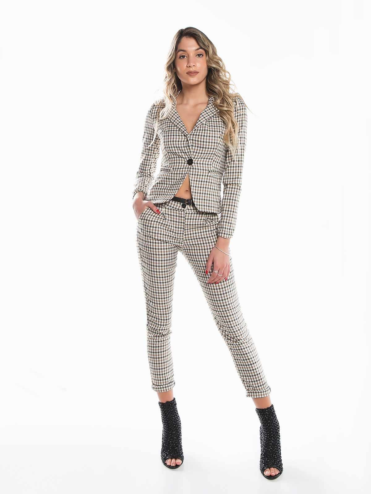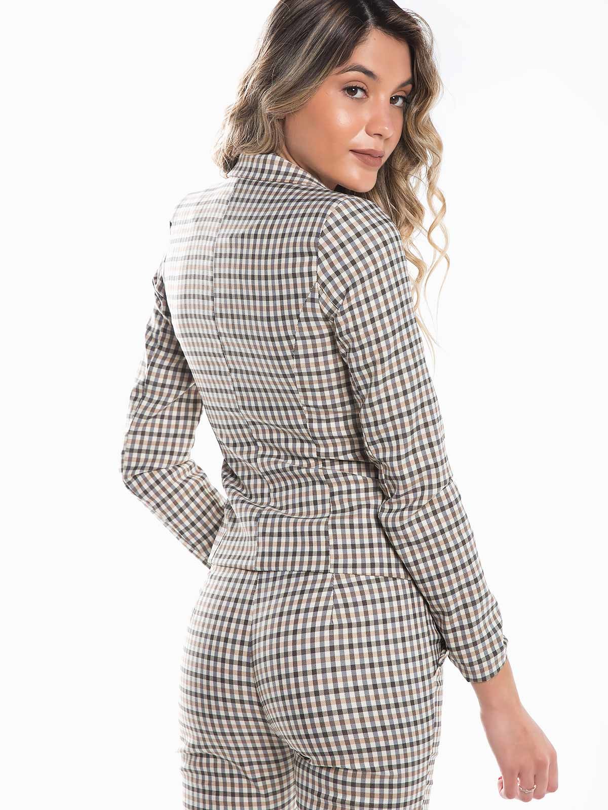 Blazer xadrez curto com 1 botão para aperto. Blazer com manga comprida e 2 bolsos.