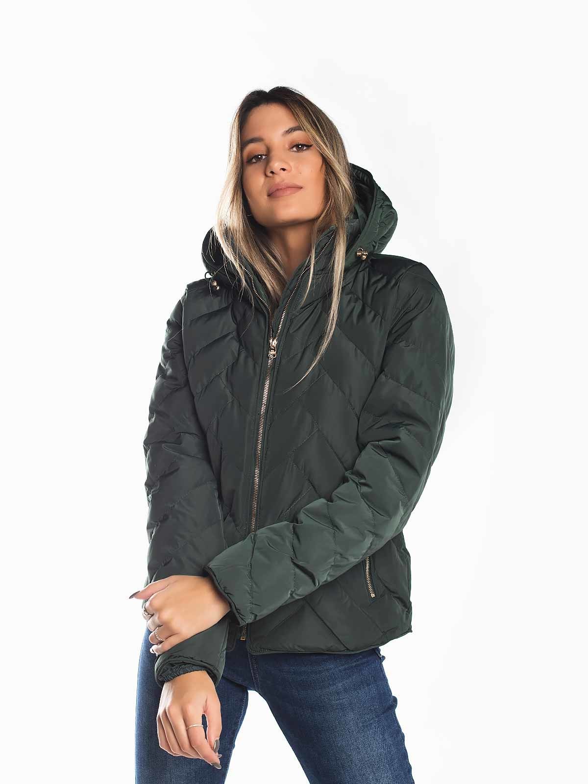 Blusão acolchoado com efeito linhas diagonais. Blusão impermeável com capuz. Bolsos e aperto com fecho dourado. A modelo está a vestir tamanho S
