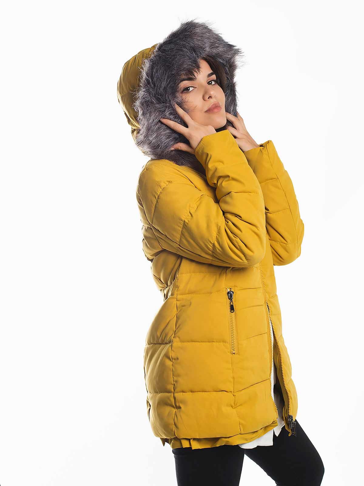 Blusão acolchoado com folho em baixo e capuz com pelo largo removivel. Blusão revisto térmico com bolsos e aperto com fecho. A modelo está a vestir tamanho S