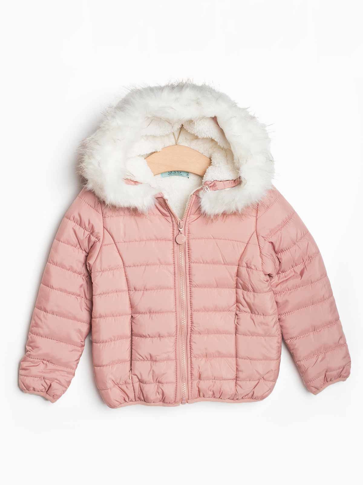 Blusão acolchoado para menina com forro e capuz em pelo fofo. Blusão canelado com bolsos e aperto em fecho.