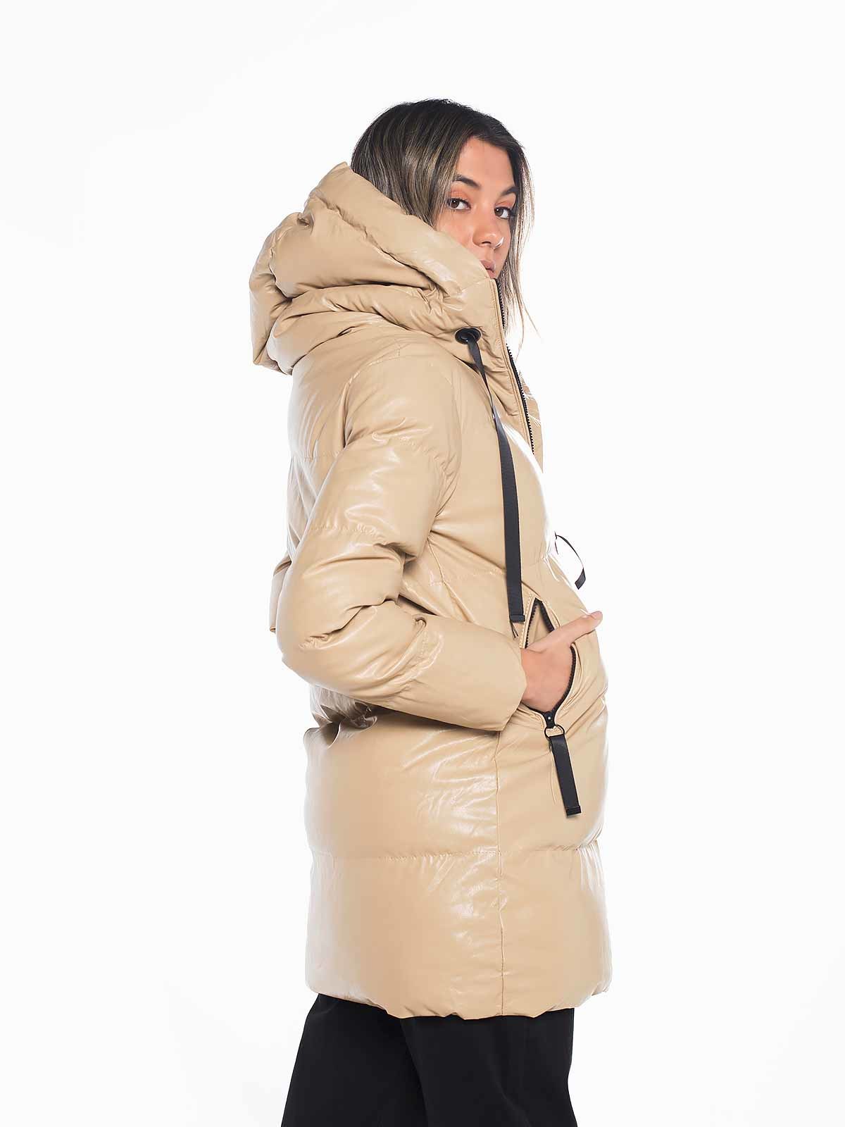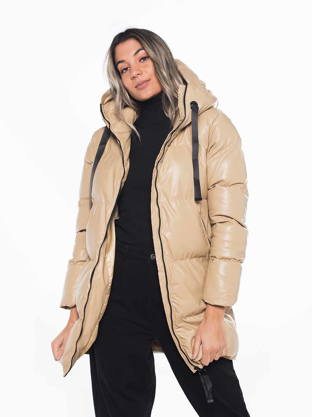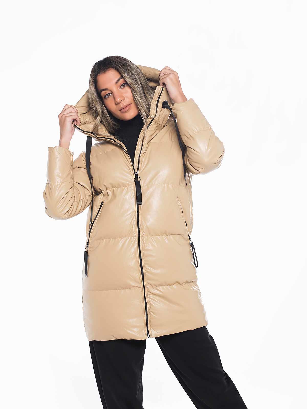 Blusão acolchoado comprido em pele sintética. Blusão impermeável com capuz bolsos laterais com fecho. Aperto de fecho éclair.