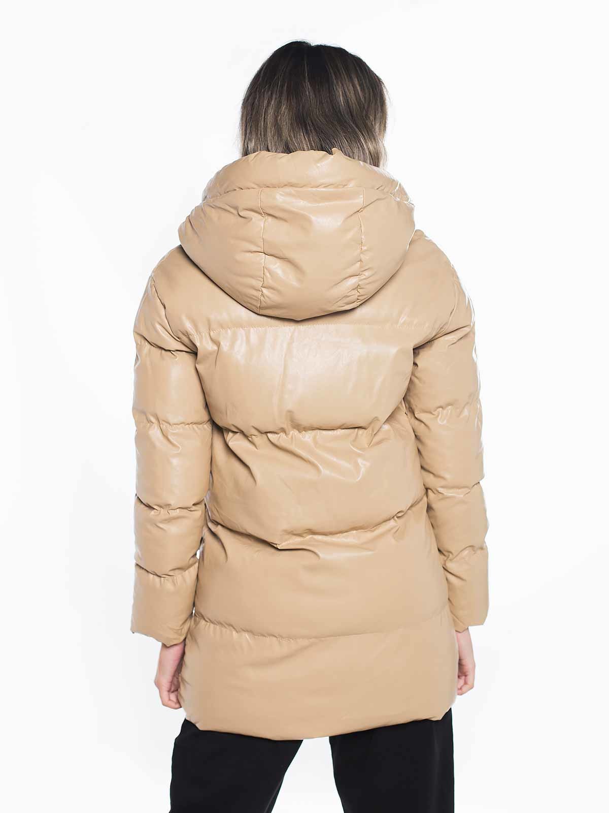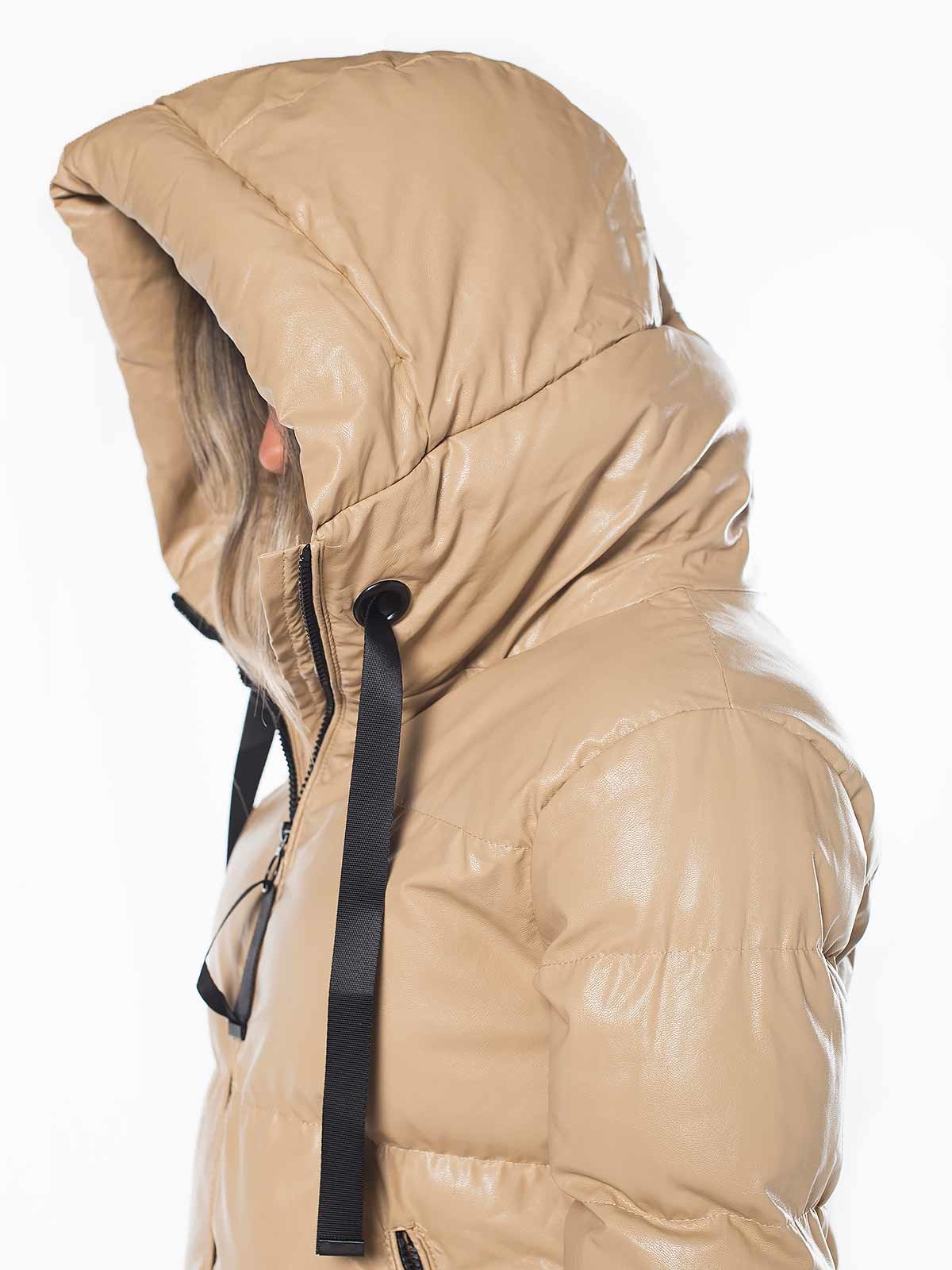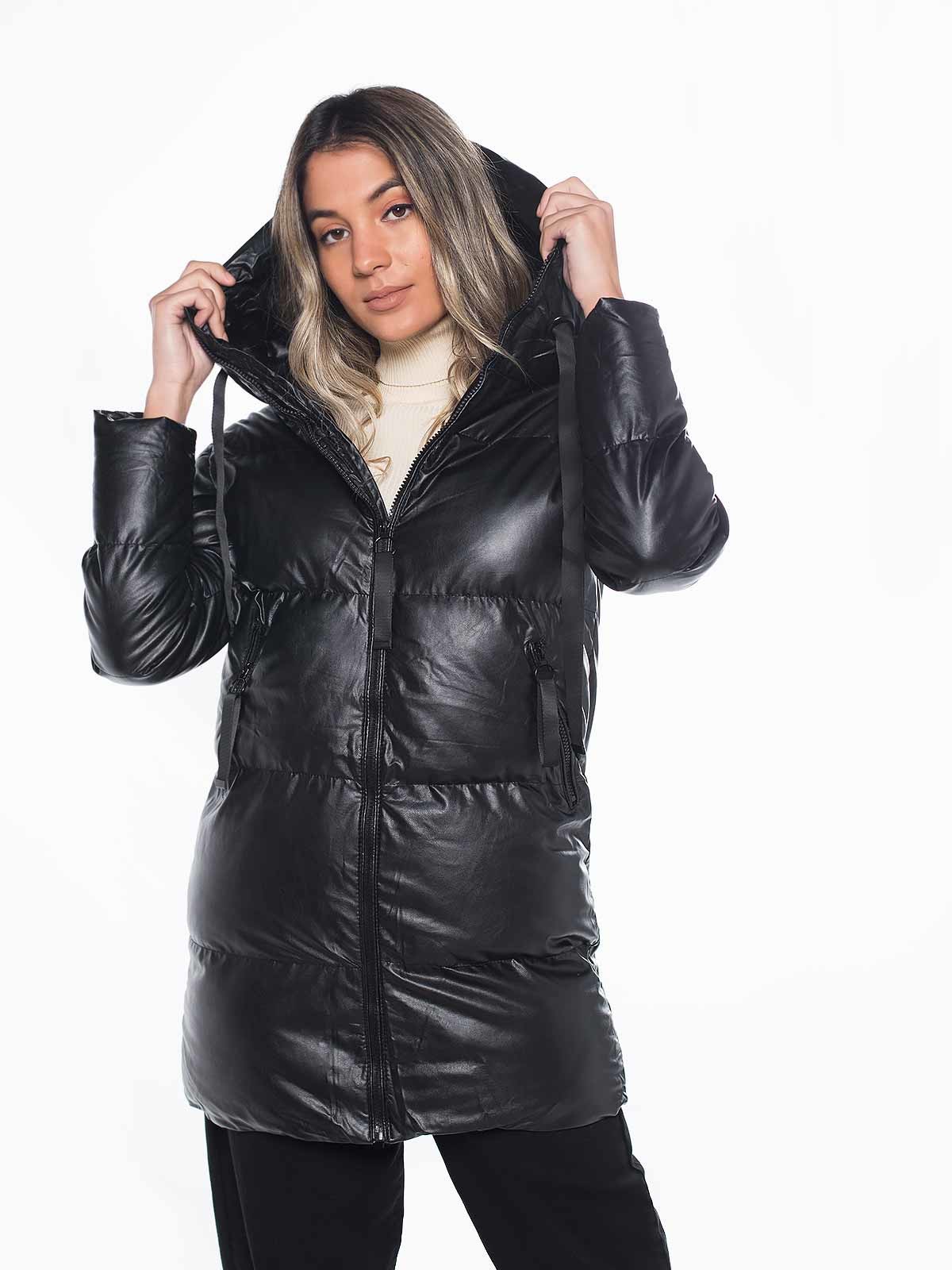 Blusão acolchoado comprido em pele sintética. Blusão impermeável com capuz bolsos laterais com fecho. Aperto de fecho éclair.