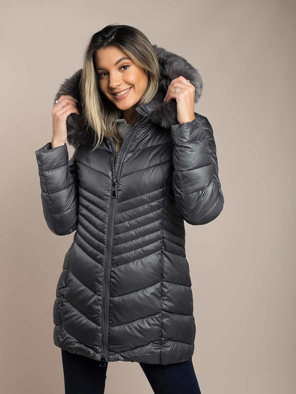 Blusão comprido acolhoado impermeável com capuz removivel com pelo. Blusão comprido com bolsos de lado e aperto de fechos. A modelo está a vestir tamanho S