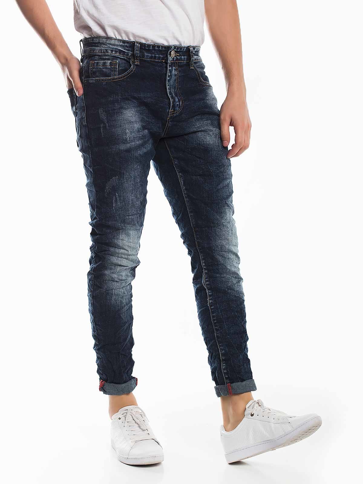 Calças de ganga slim jeans para homem manchados lavagem escura. Calças de ganga com rotos leves. 5 bolsos aperto de fecho e botão. O modelo está vestir tamanho 40