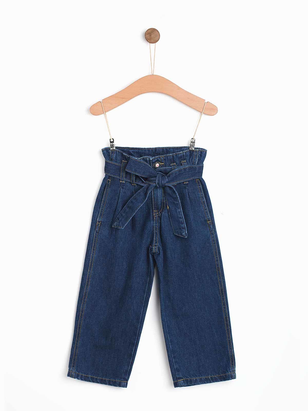 Calças ganga largas com folho e cinto largo em ganga para laço. Calças com cinta elástica aperto de fecho e botão. Bolsos de lado e atrás.