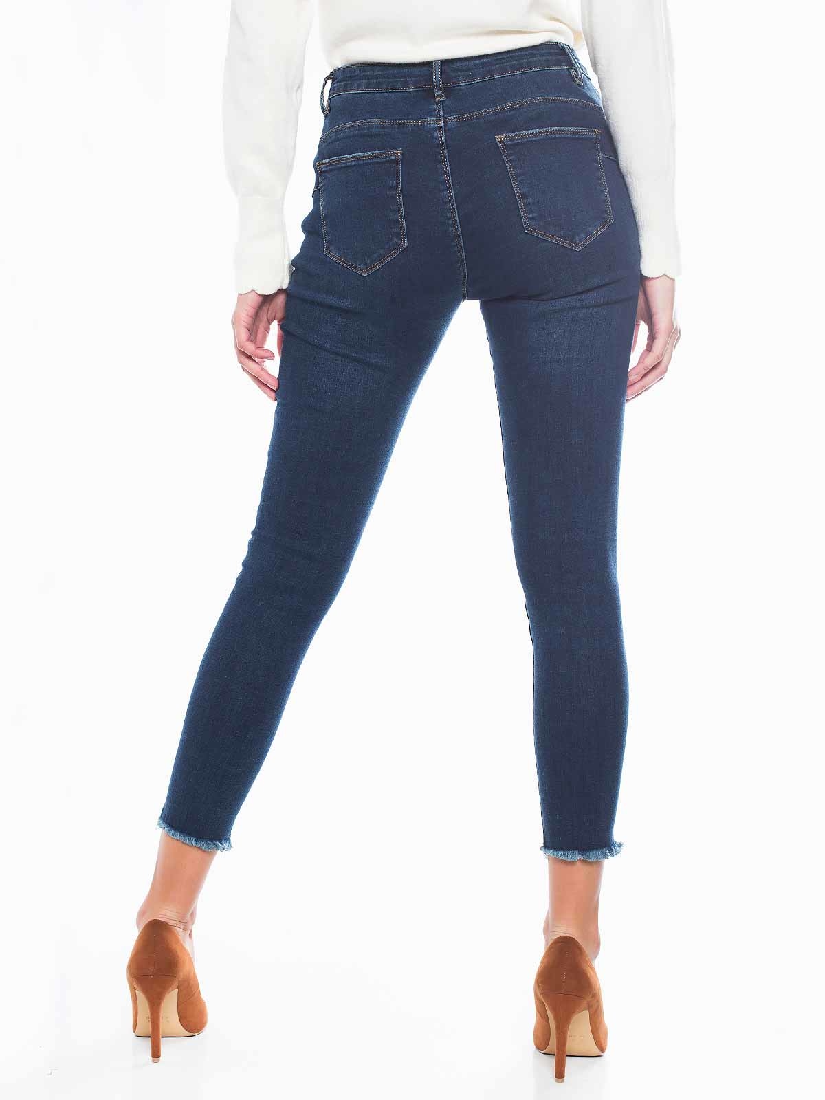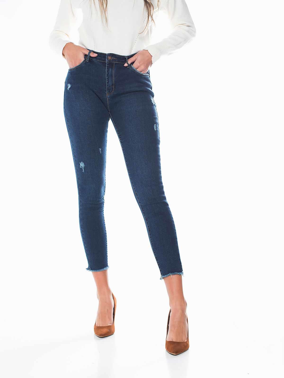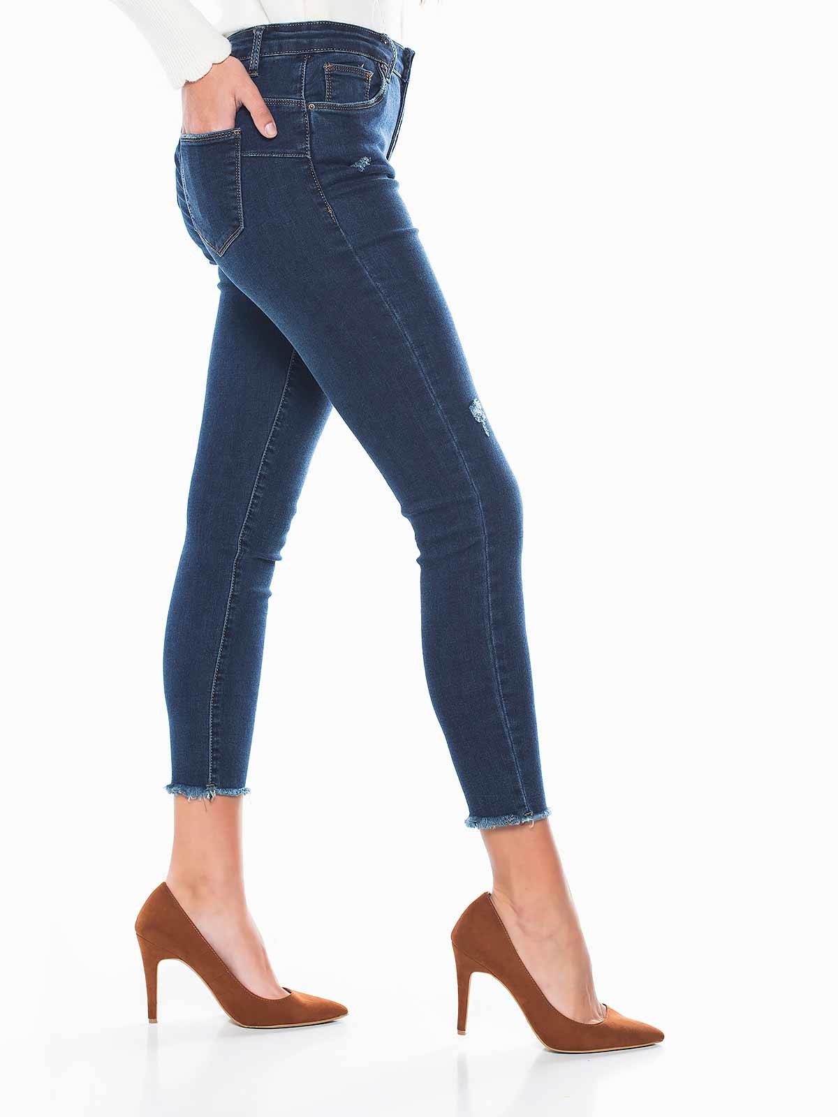 Calças de ganga push up com bainha e rotos desfiados. Skinny jeans de cintura alta. 5 bolsos. Aperto de fecho éclair e botão.