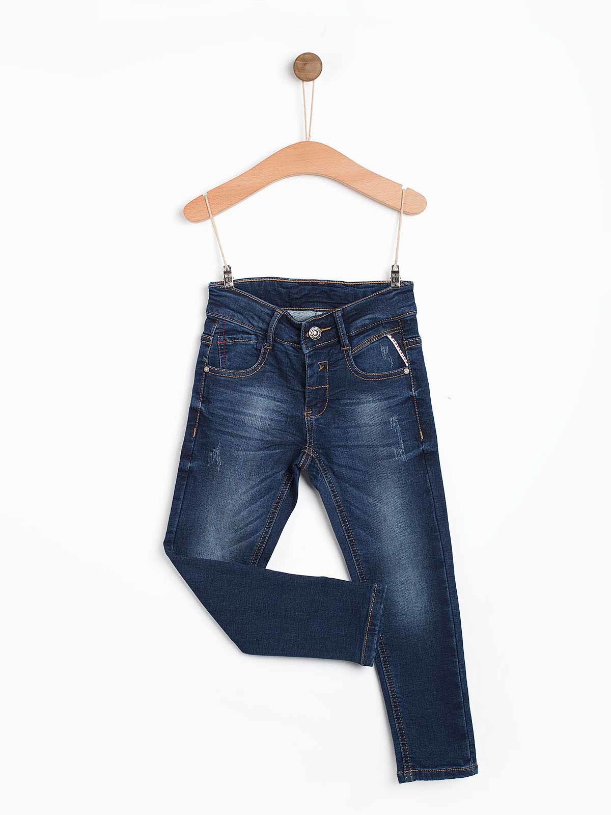 Calças ganga lavagem manchada com rasgos leves. Calças com ajustador aperto de fecho e botão.