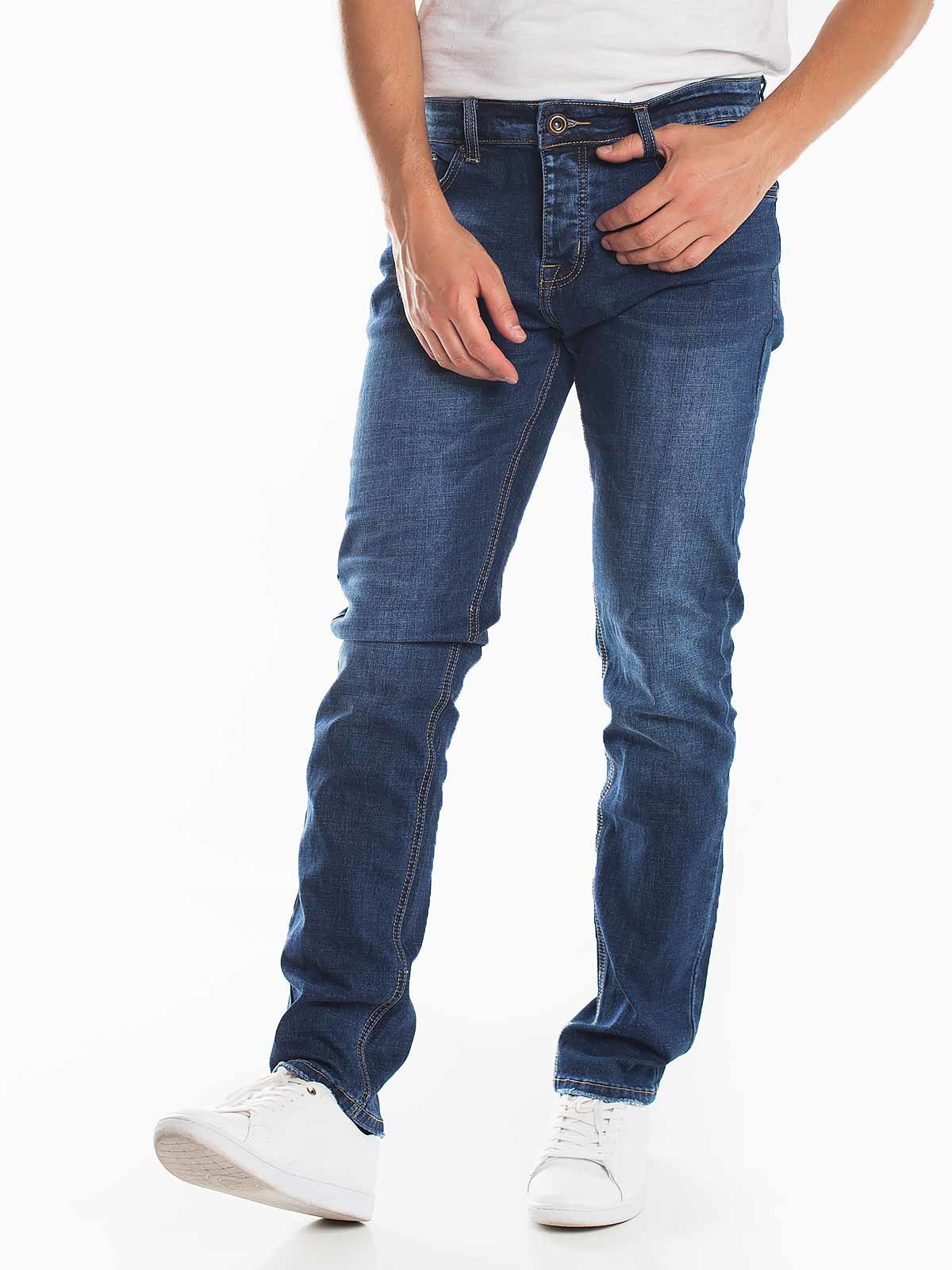 Calças ganga straight jeans para homem. Calças lavagem escura perna normal. Aperto de fecho e botão 5 bolsos.