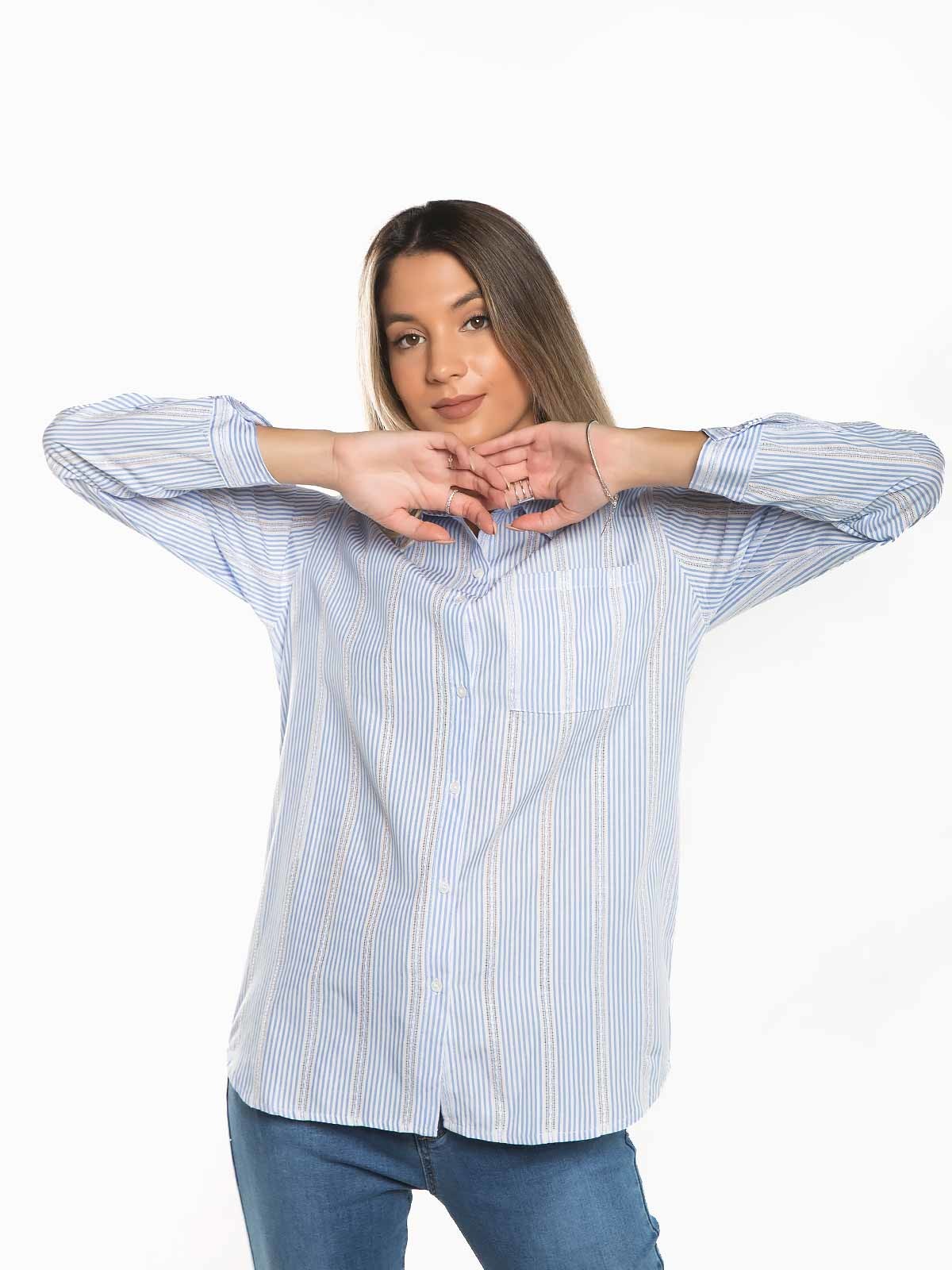 Camisa às riscas com renda e pérolas aplicadas no colarinho manga comprida