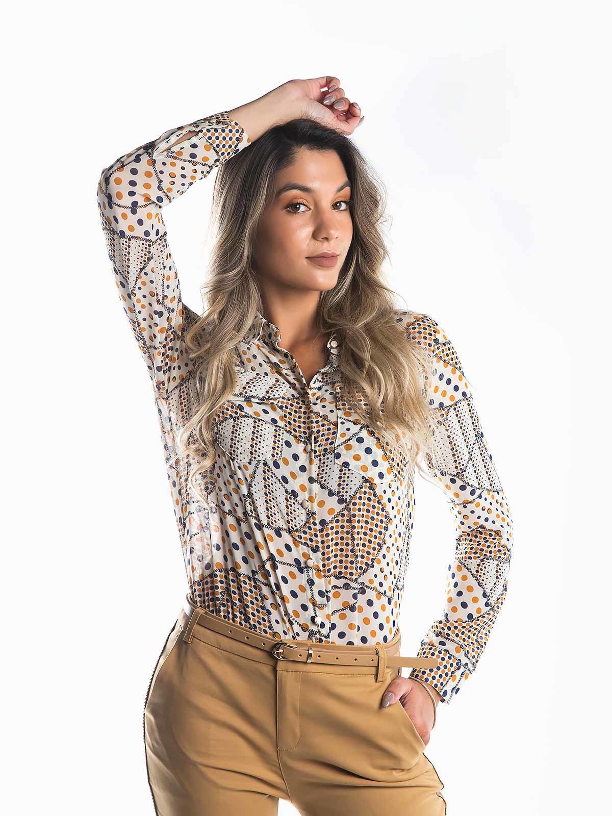 Camisa de mulher estampado padrão bolas com molas de aperto manga comprida bolsos no peito