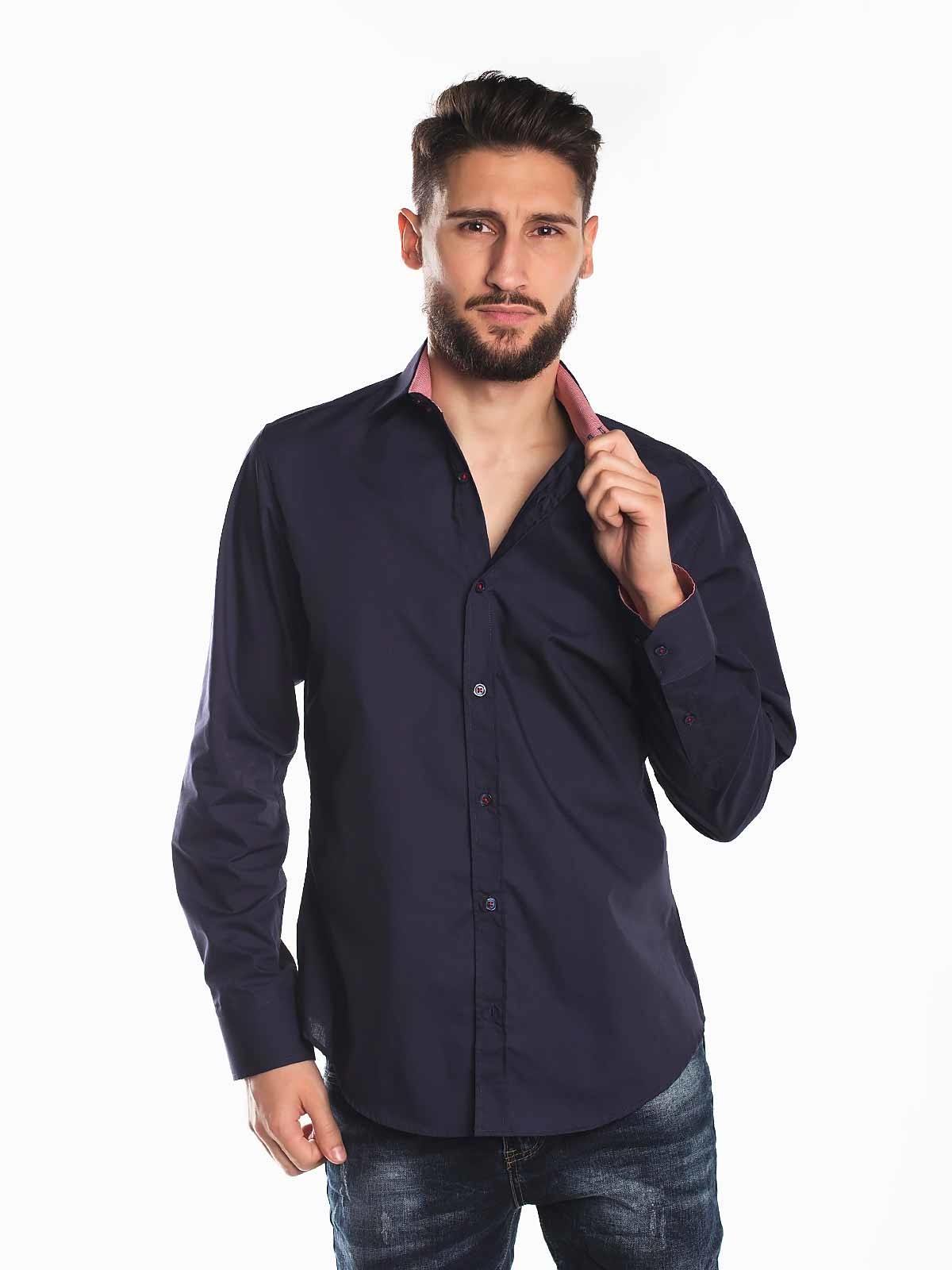 Camisa lisa manga comprida para homem. Camisa em tecido com padrão no colarinho mangas e caseado.