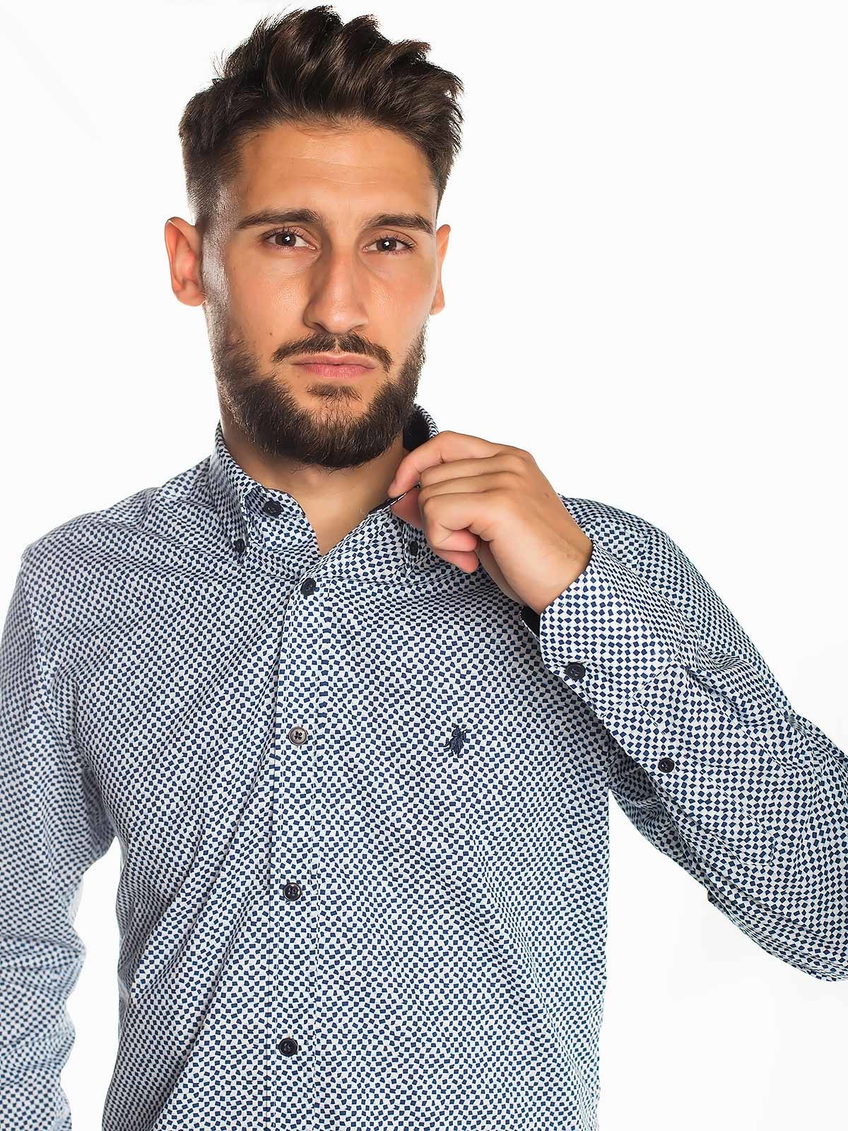 Camisa estampada para homem com padrão quadrados. Camisa manga comprida de colarinho e aperto em botões.
