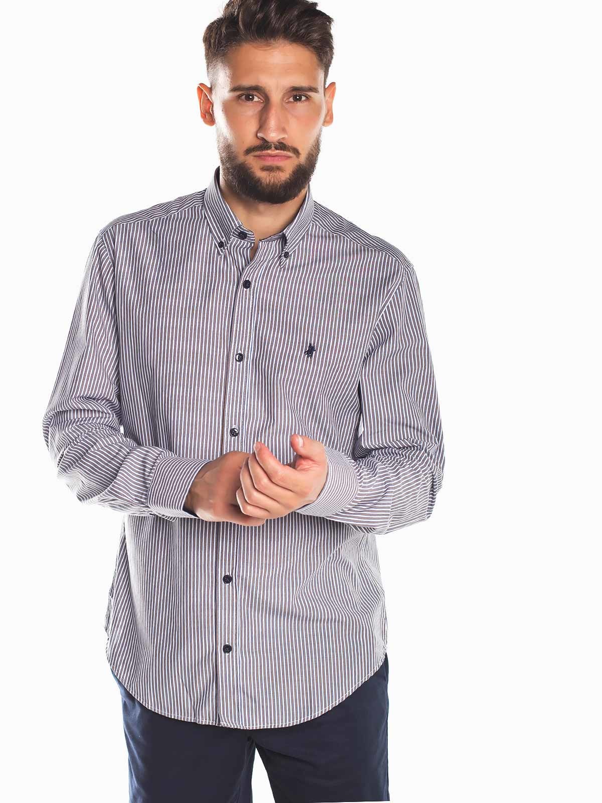 Camisa de riscas manga comprida para homem com bordado no peito. Camisa de colarinho e aperto com botões.