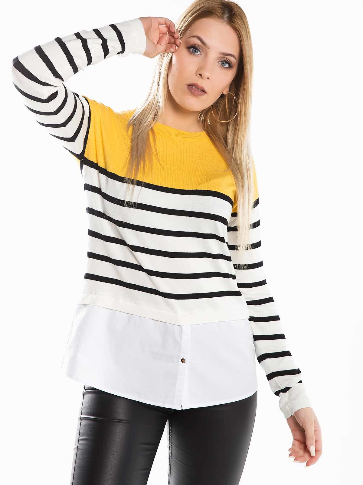 Camisola de malha com encaixe de blusa e botão padrão riscas com cor decote redondo manga comprida