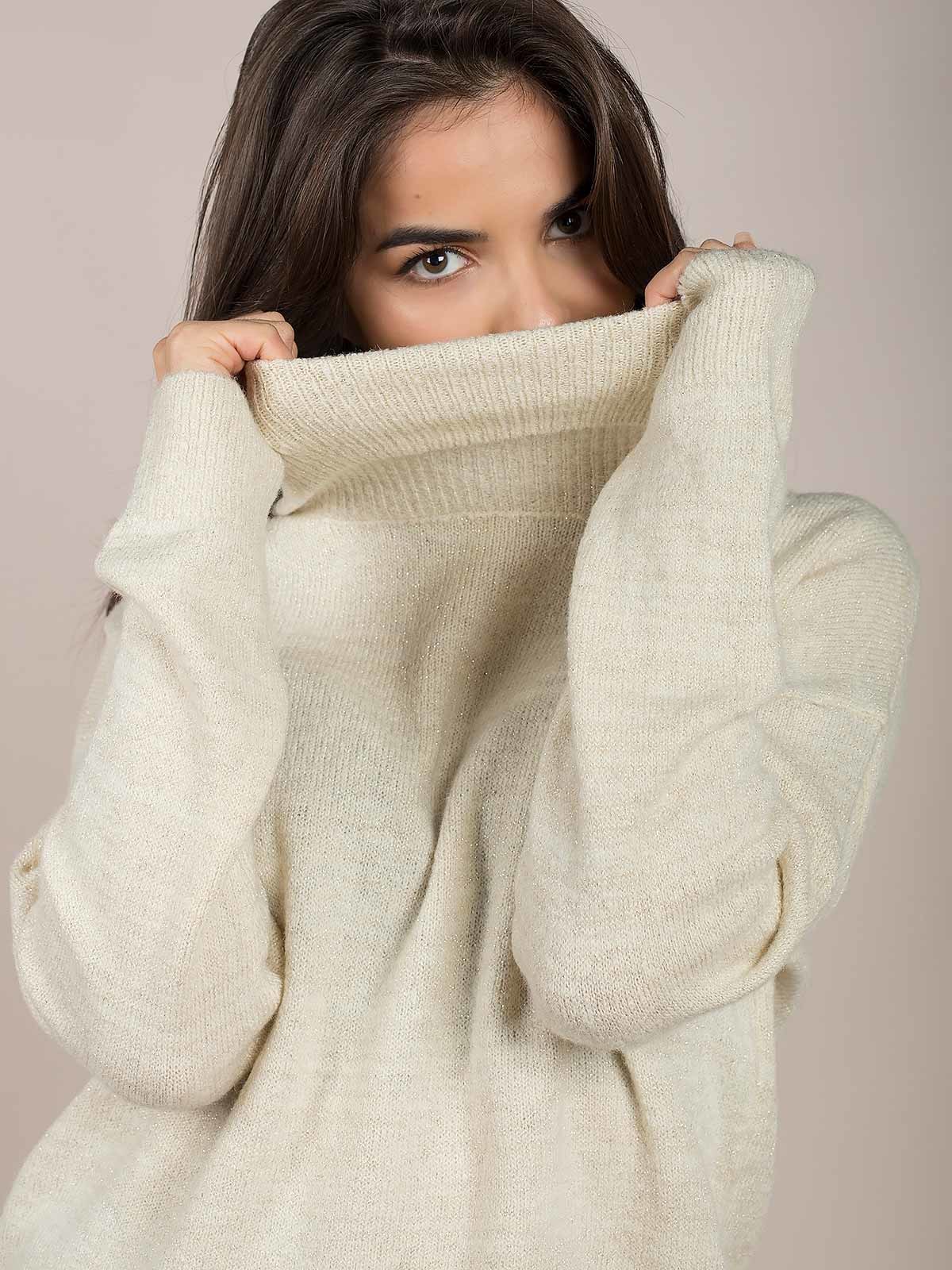 Camisola malha brilhante gola alta canelada. Camisola malha manga comprida com extremidades caneladas.