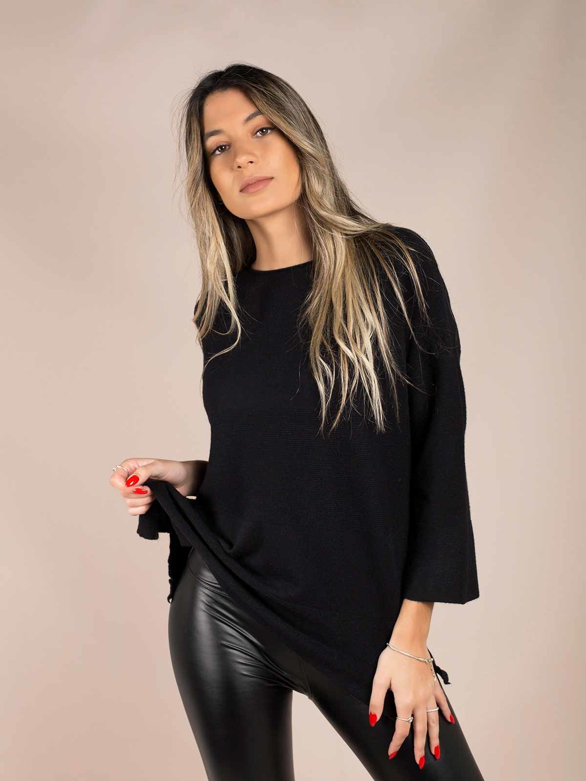Camisola malha fina manga 3/4. Camisola manga comprida com racha de lado. A modelo está a vestir tamanho S/M