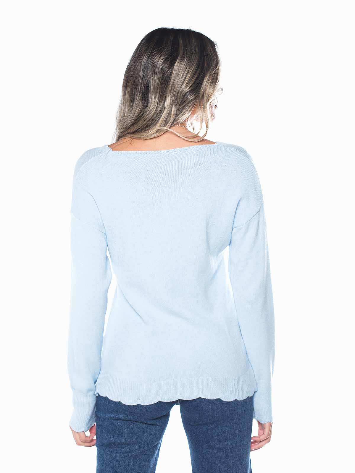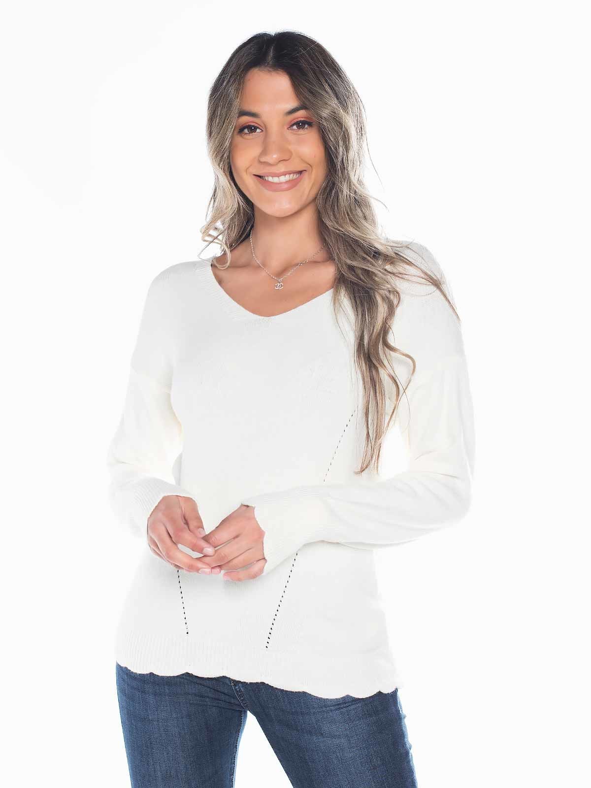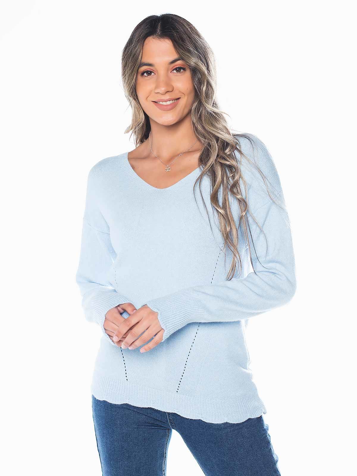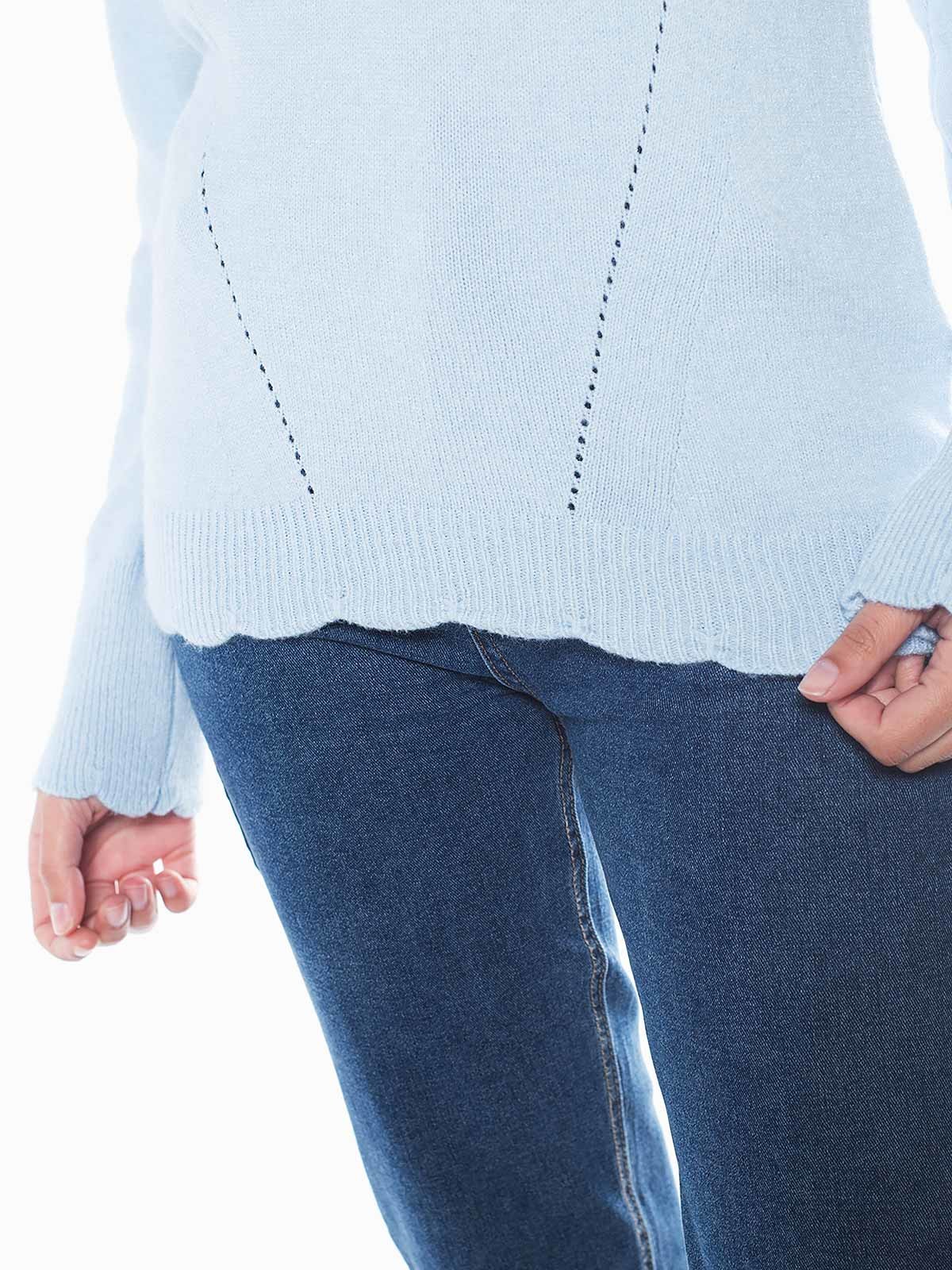 Camisola de malha lisa com pormenores abertos. Camisola com extremidade inferior recortada manga comprida com punhos elásticos. Decote em V.