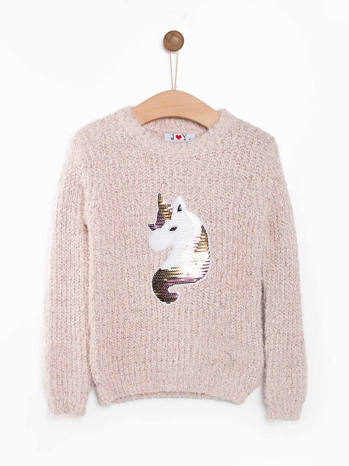 Camisola malha menina com únicornio em lantejoulas. Camisola malha trabalhada manga comprida decote redondo.