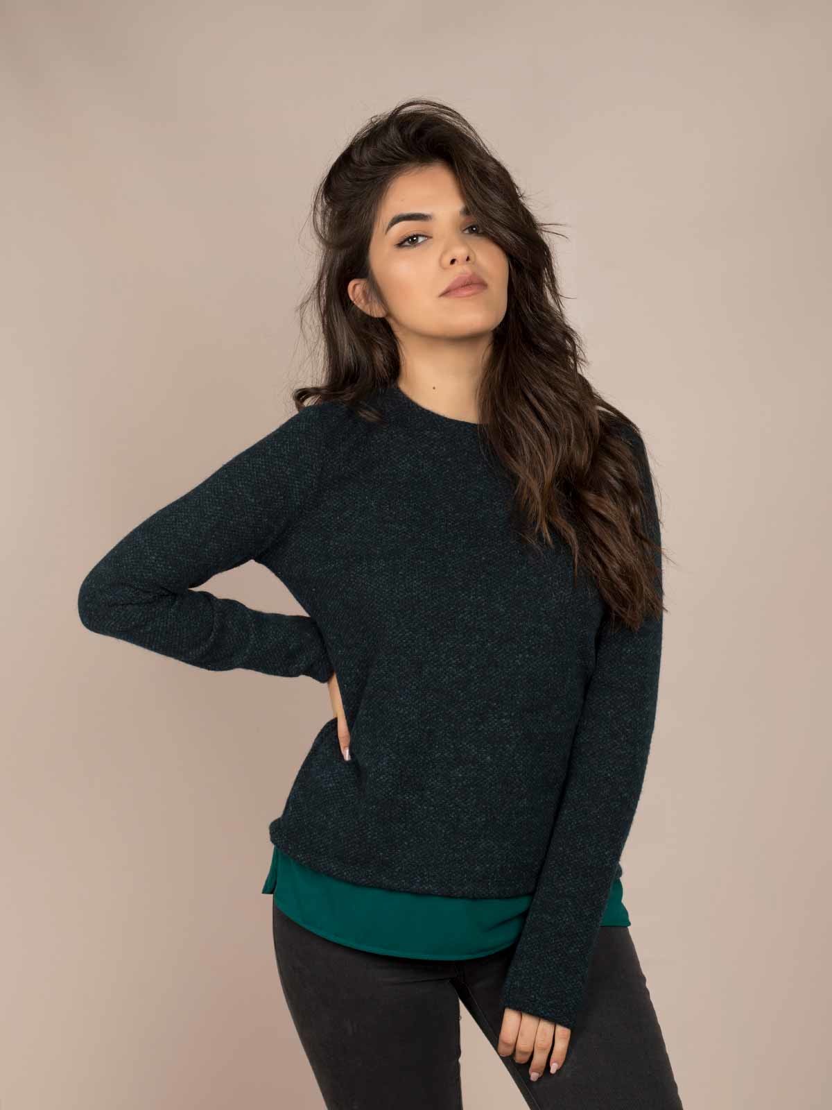 Camisola malha mesclada decote redondo encaixe tecido em baixo. A modelo está a vestir tamanho S