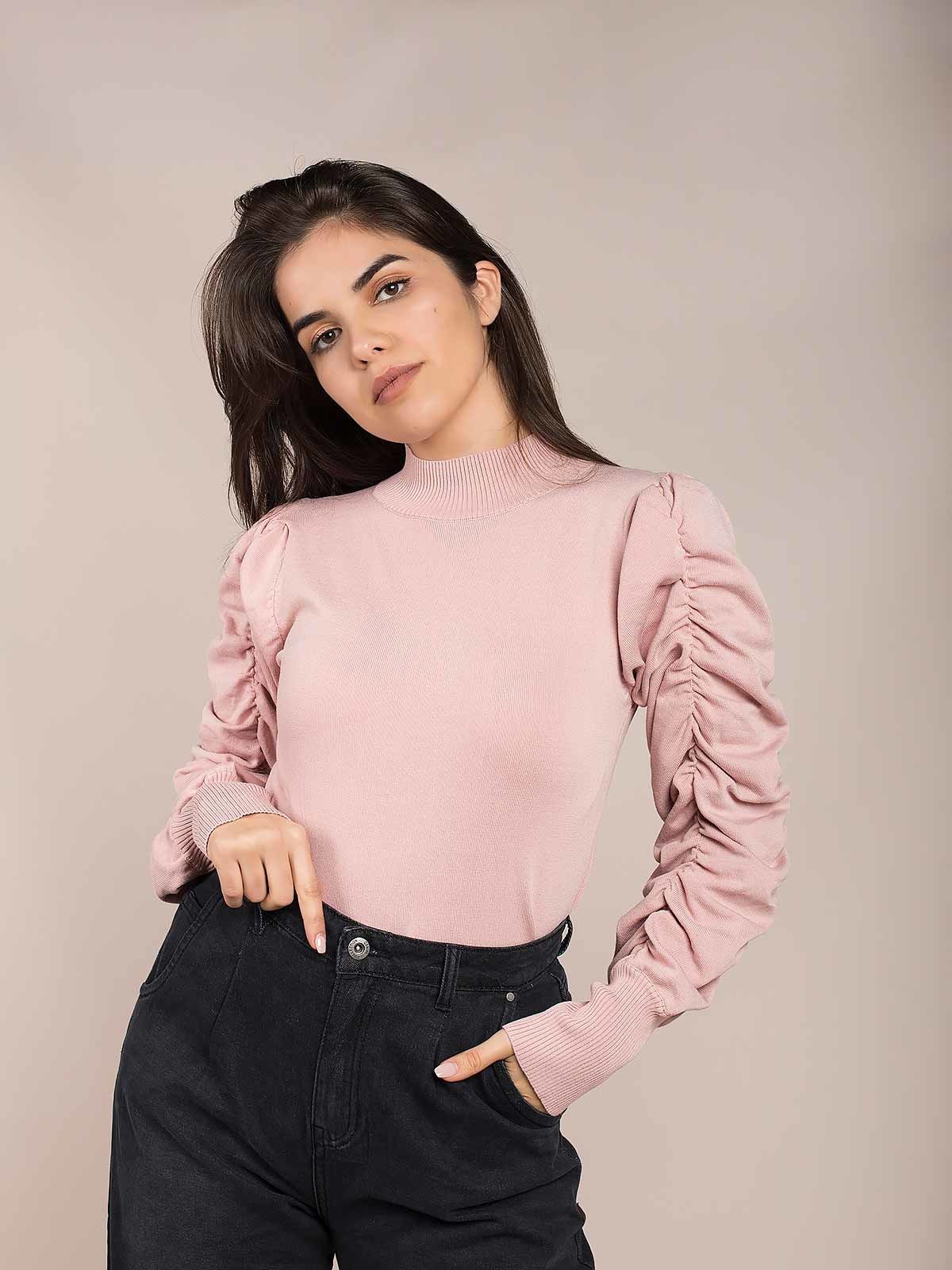 Camisola manga larga em balão com efeito costura. Camisola meia gola com extremidades caneladas.