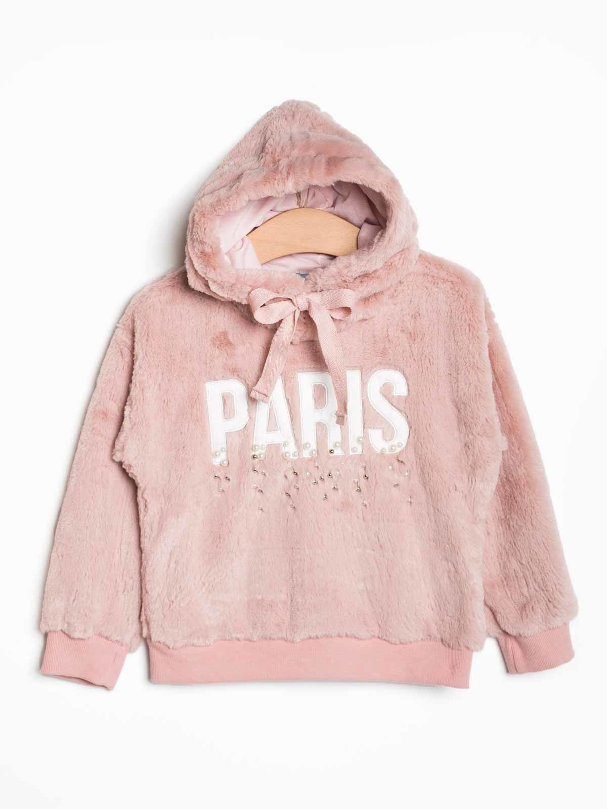Camisola menina em pelo fofo com pérolas e estampado Paris na frente. Camisola manga comprida com capuz e laço.