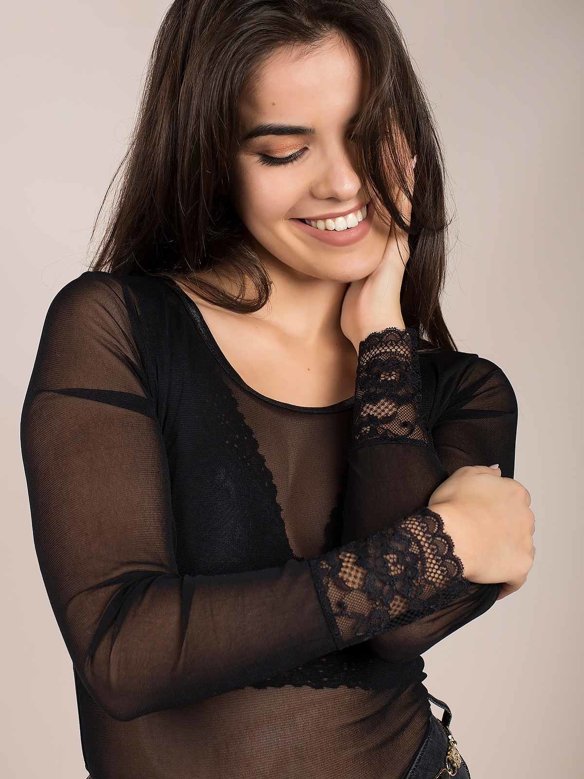 Camisola transparente manga comprida punho rendado. Decote redondo