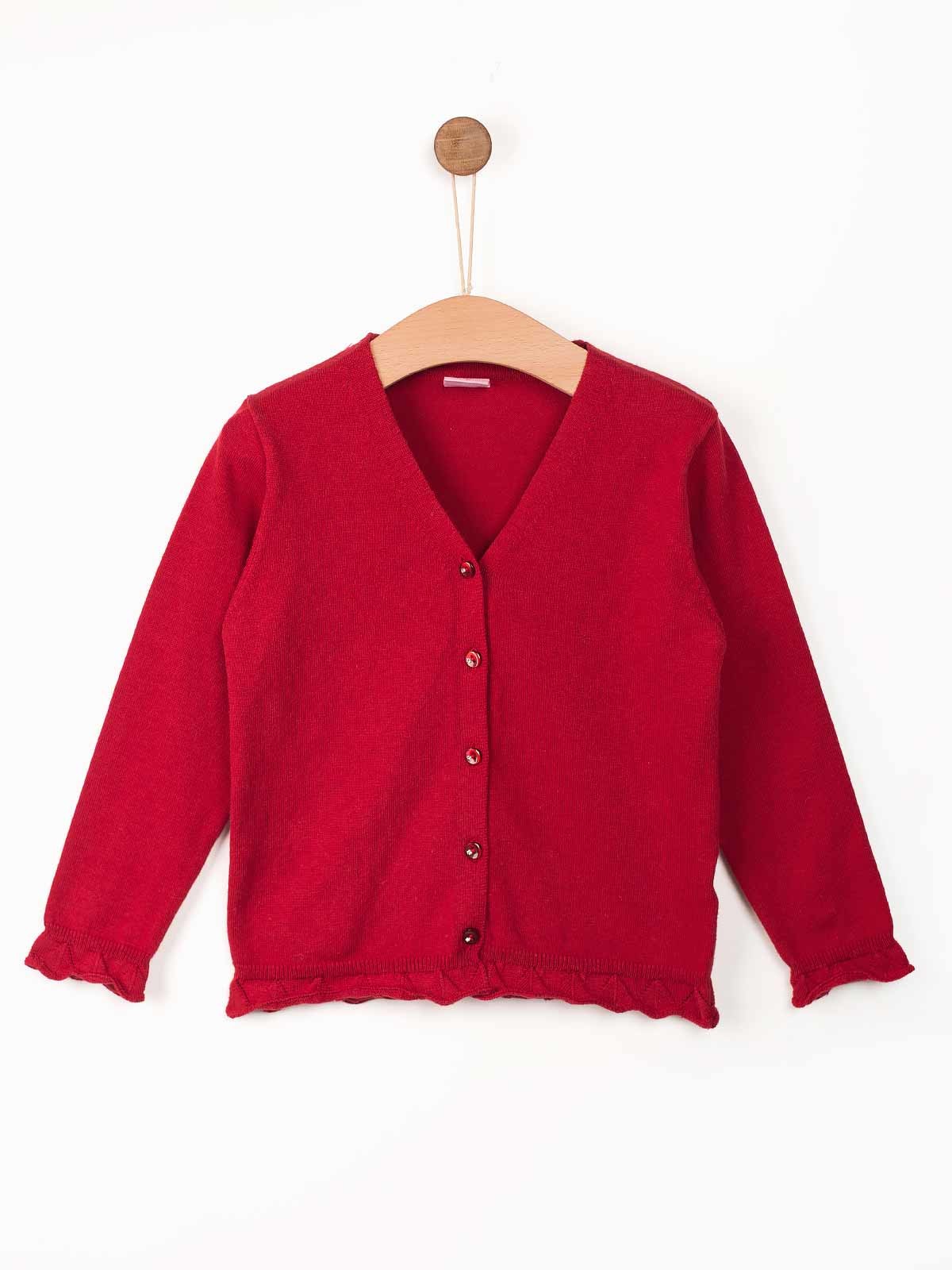 Casaco de malha com folhos nas extremidades. Decote em V aperto de botões na frente.