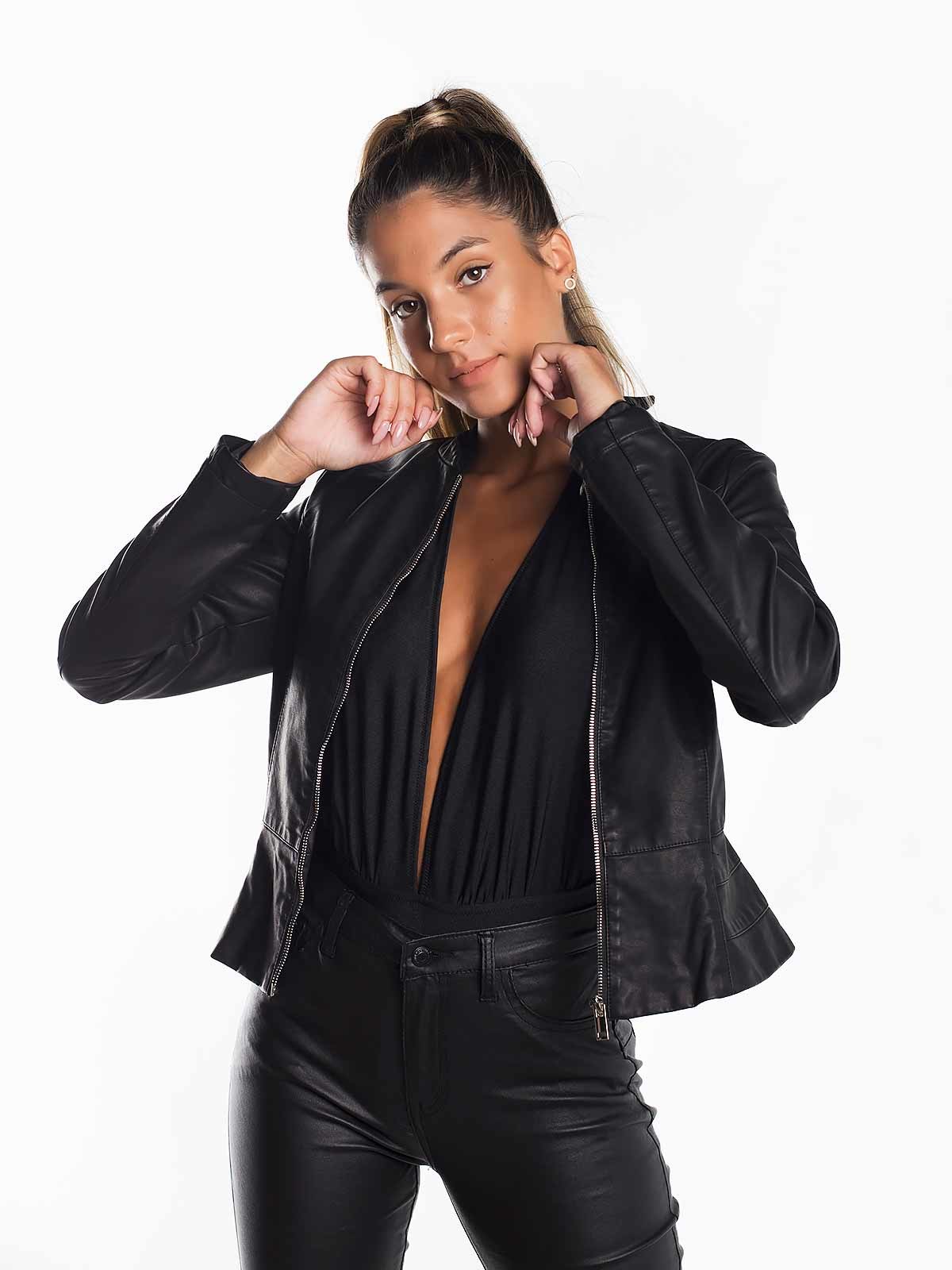 Casaco de pele sintético encaixe efeito folho em baixo. Casaco de gola redonda de aperto com fecho zíper.