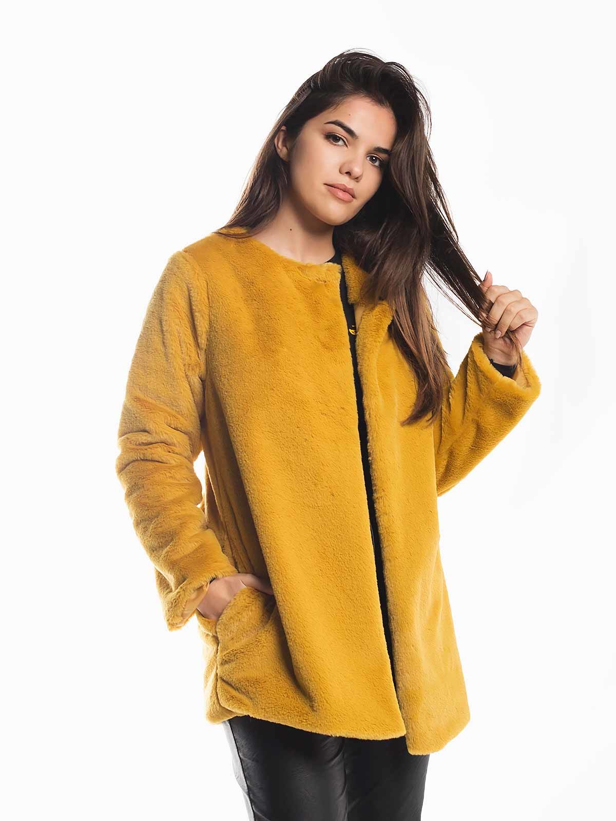 Casaco comprido de pelo fofo com molas de aperto na frente. Casaco quente de decote redondo com forro suave.