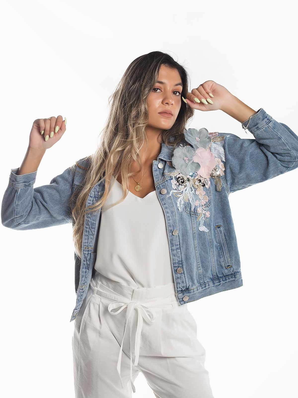 Casaco ganga clara com flores aplicadas no peito aperta com botões.