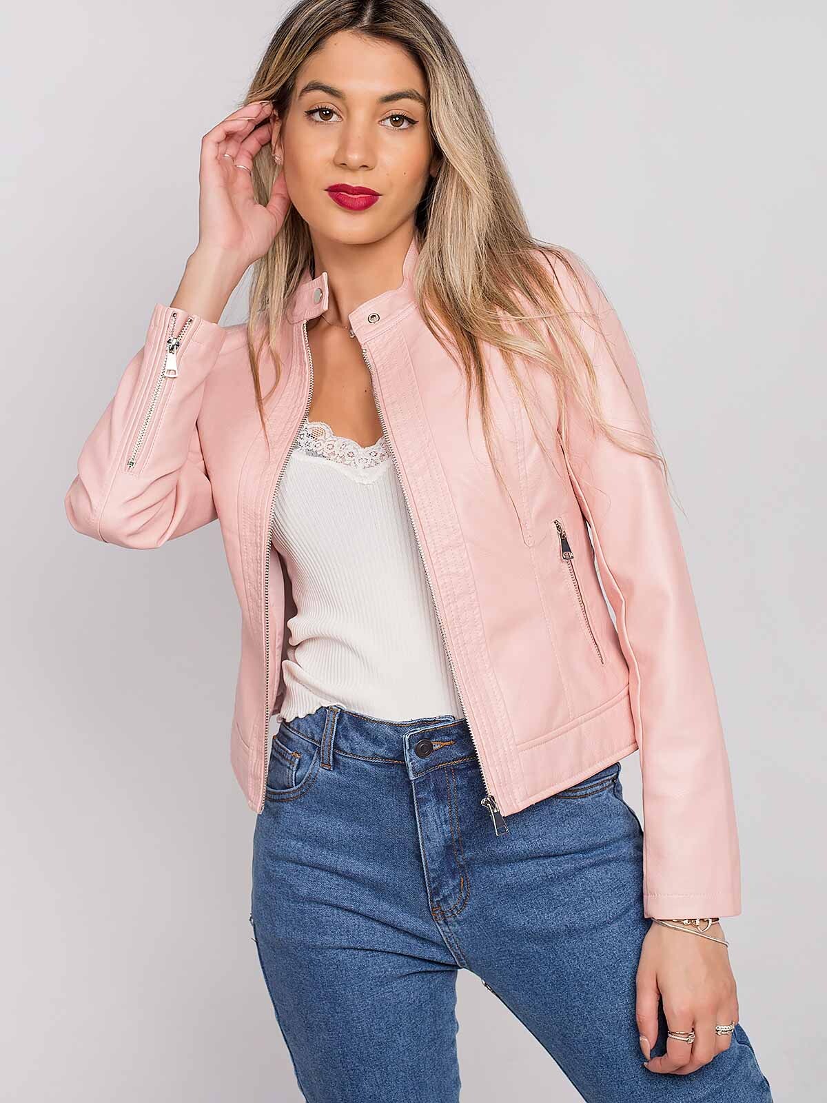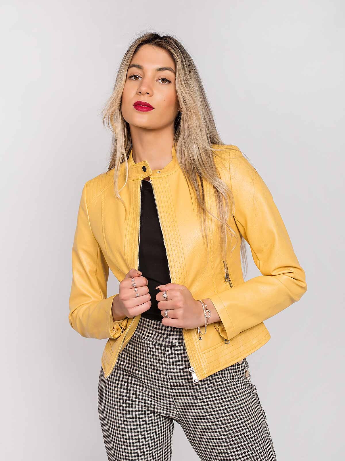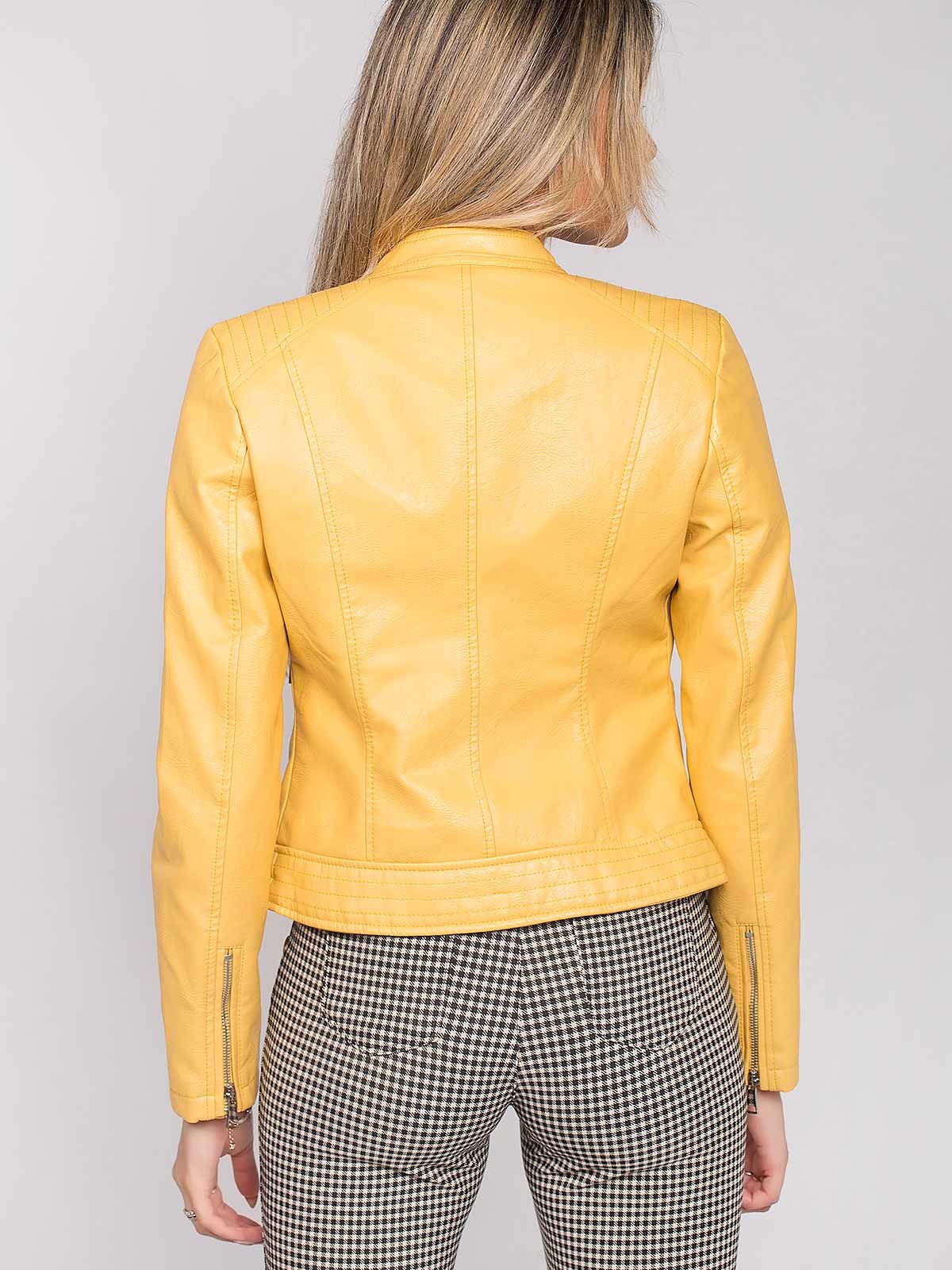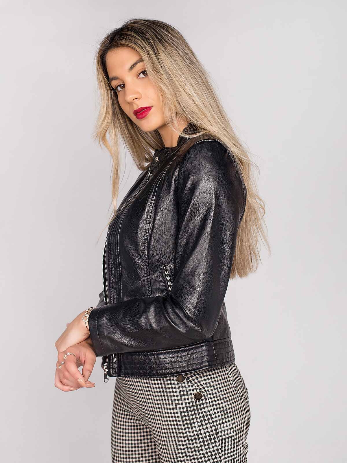 Casaco curto de pele sintética cintado. Casaco pele gola redonda com aperto de botão e fecho ziper. Bolsos de lado.