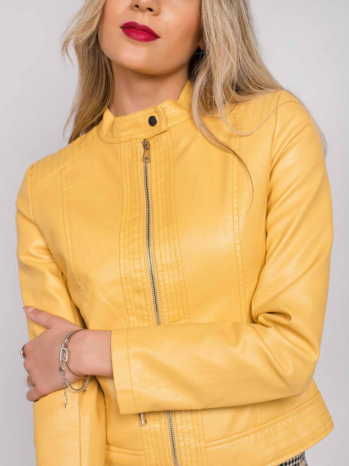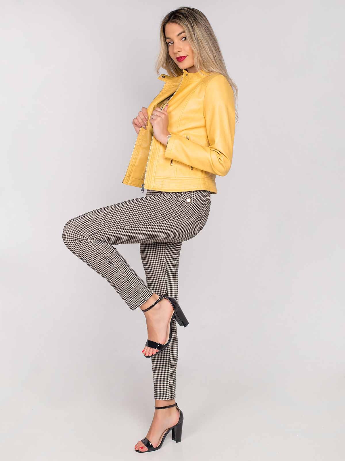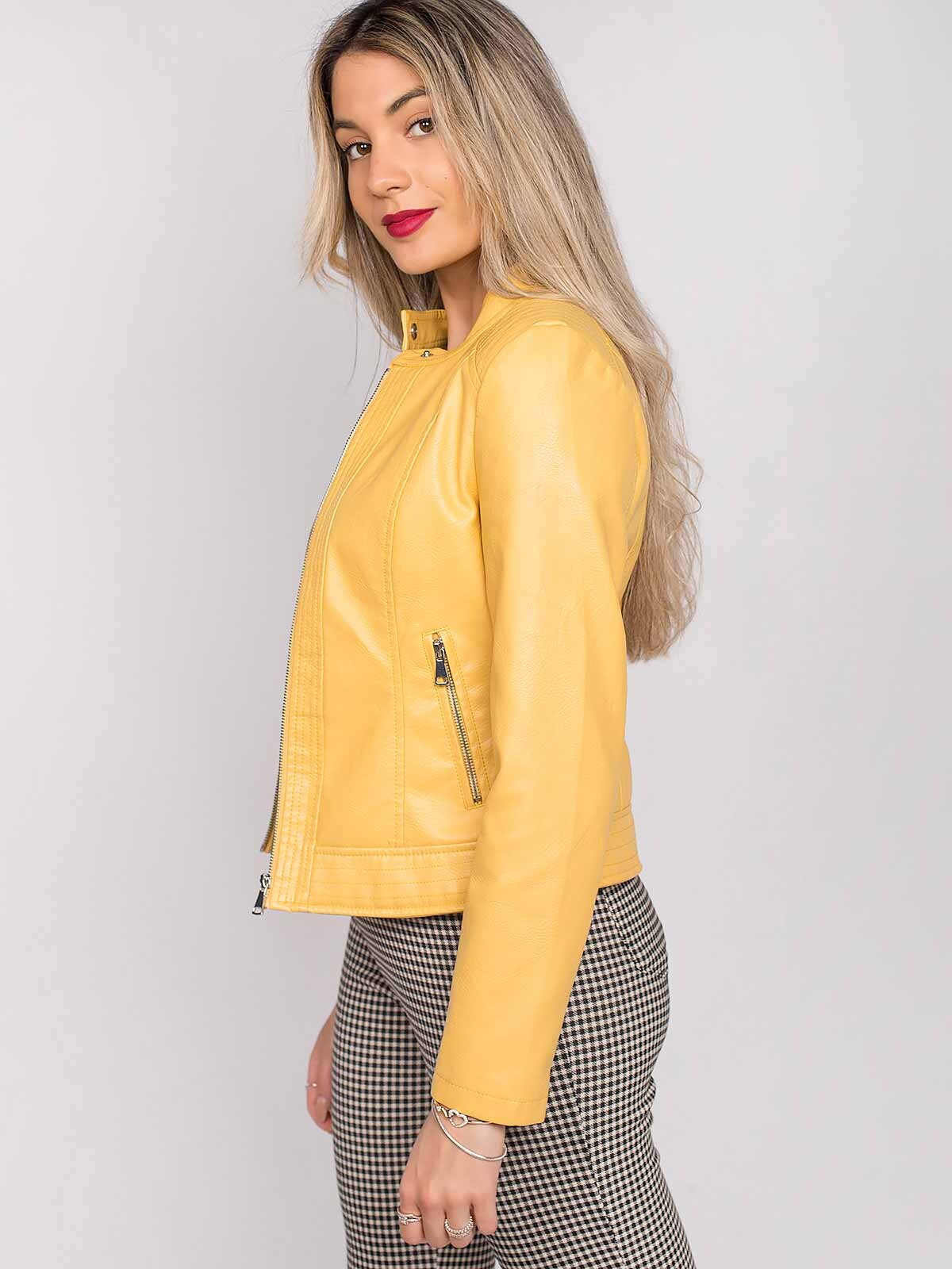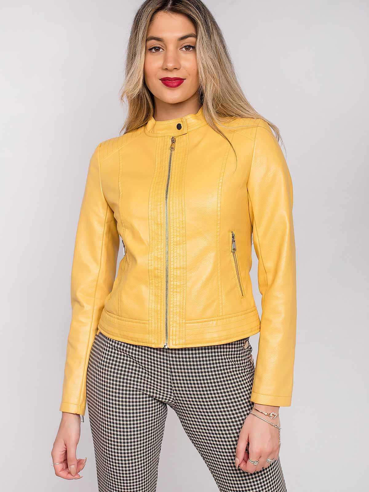 Casaco curto de pele sintética cintado. Casaco pele gola redonda com aperto de botão e fecho ziper. Bolsos de lado.
