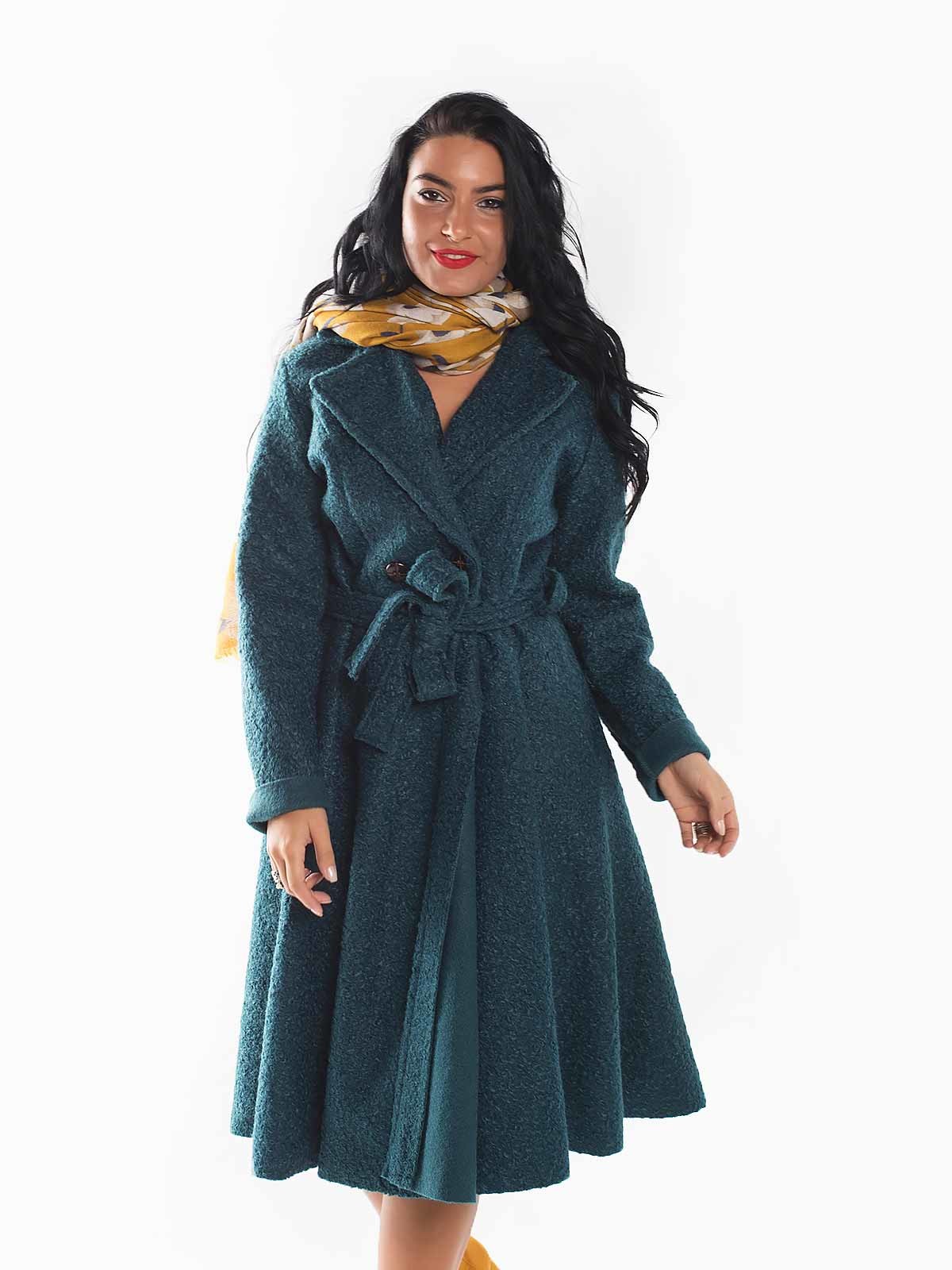 Casaco trench com cinto largo em tecido grosso pisoado. Casaco quente comprido de lapelas largas com botões na frente.