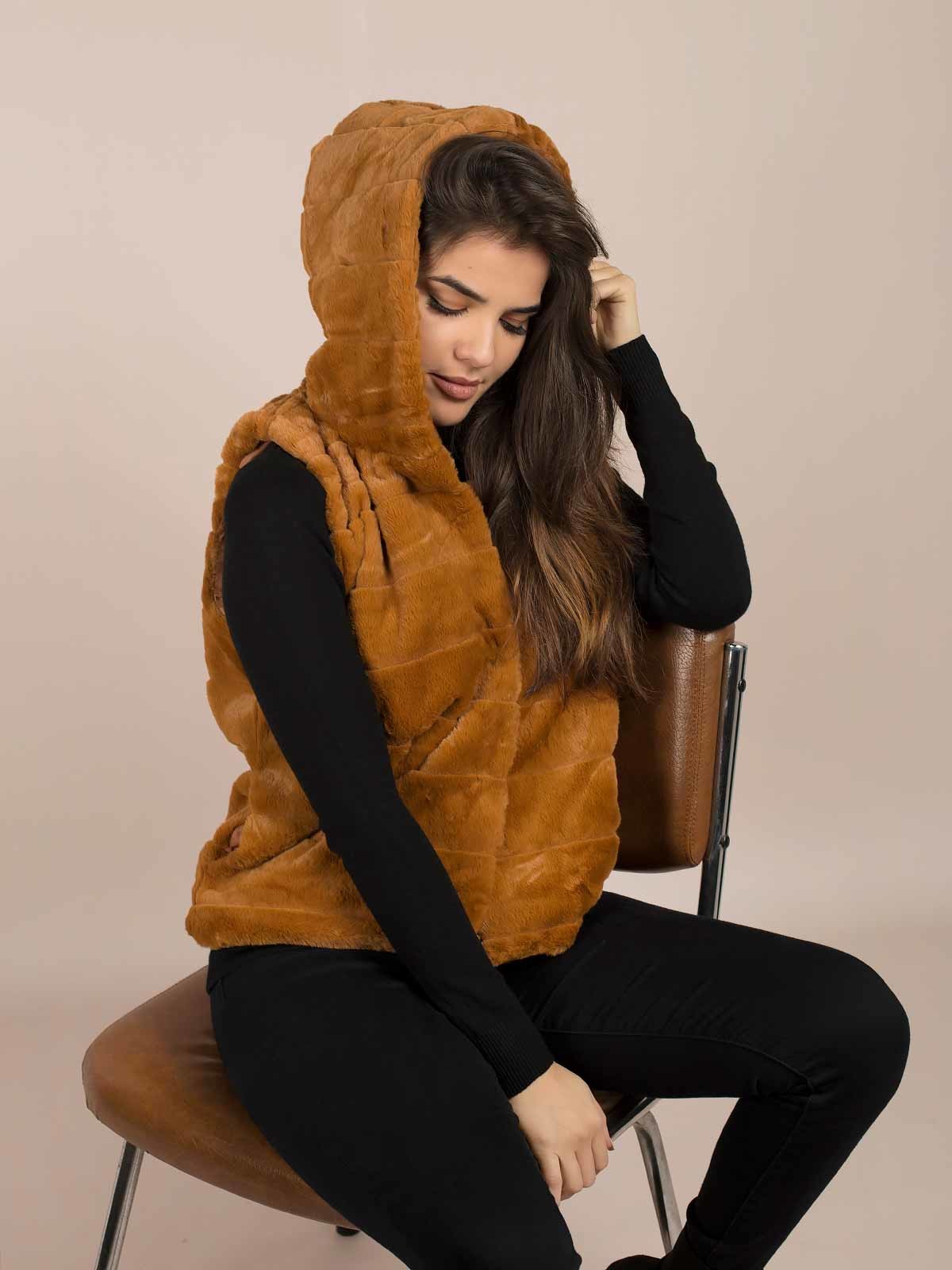 Colete efeito canelado em pêlo com capuz. Aperta com molas. A modelo está a vestir tamanho S