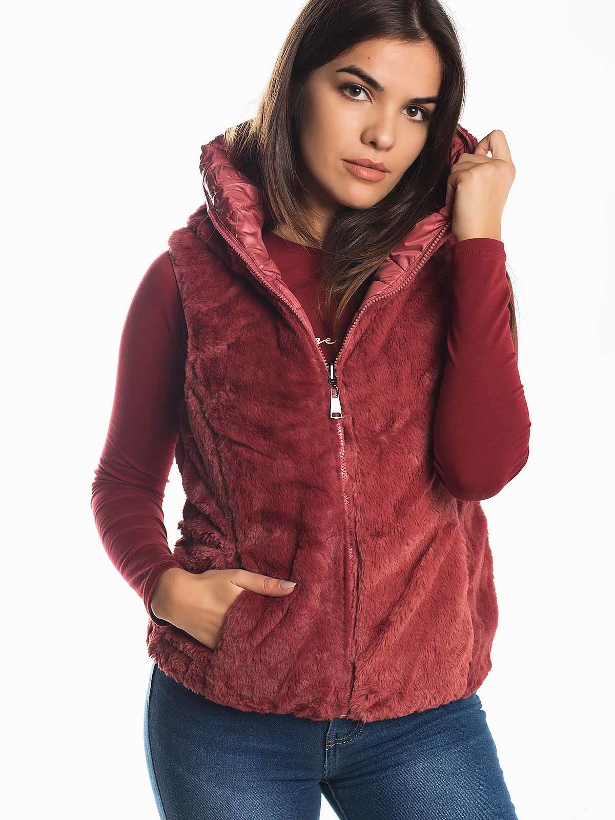 Colete reversivel impermeável com pelo e capuz para senhora. Colete acolchoado com pelo fofo. Bolsos de lado. A modelo está a vestir tamanho S