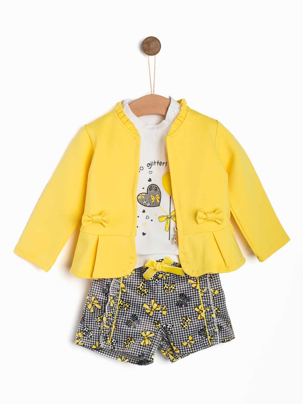 Conjunto de bebé 4 peças. Casaco liso com folho calções xadrez camisola e meia