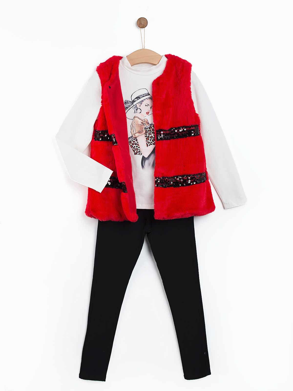 Conjunto de menina com colete em pelo e aplicação de lantejoulas. Camisola estampada e leggings lisas com cinta elástica.