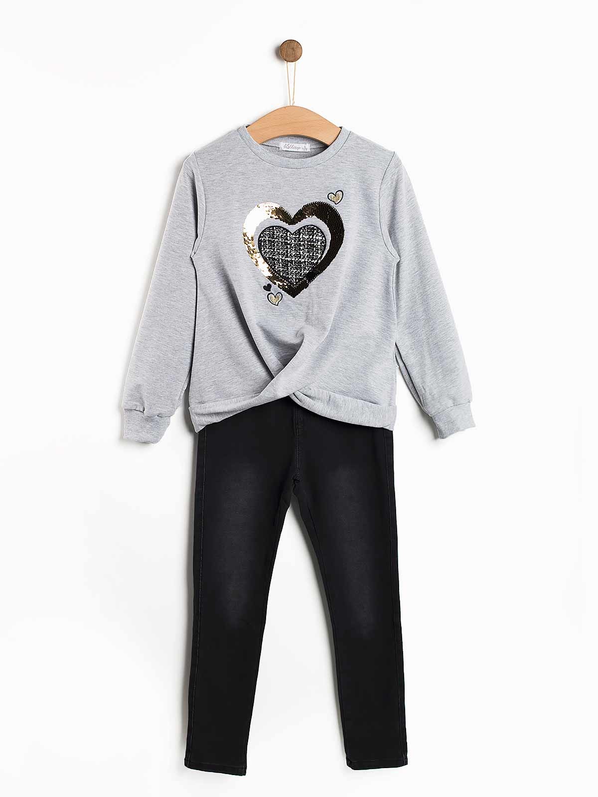 Conjunto menina com lantejoulas 2 peças- Camisola manga comprida com pregas de efeito. Jeggings confortáveis com ligeiros manchados.