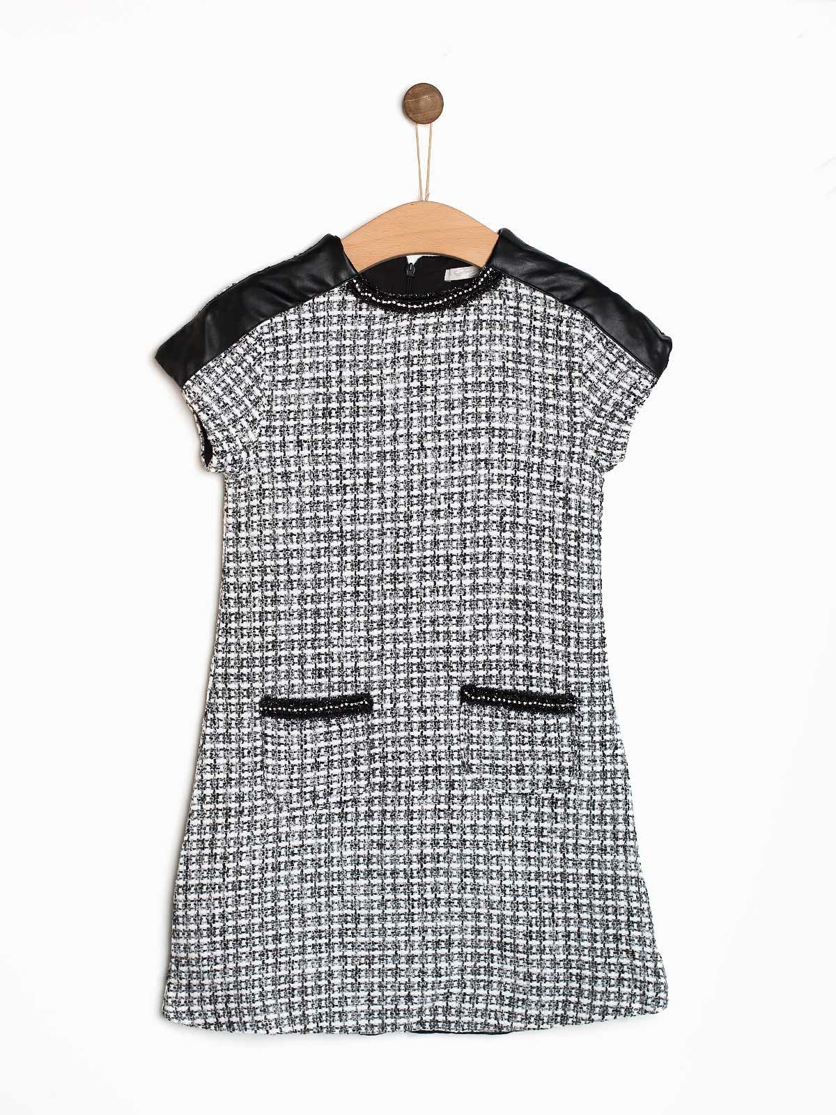 Conjunto vestido menina mesclado com camisola manga comprida básica. Vestido de encaixe pele sintética nos ombros. Bolsos na frente. Aperto nas costas.