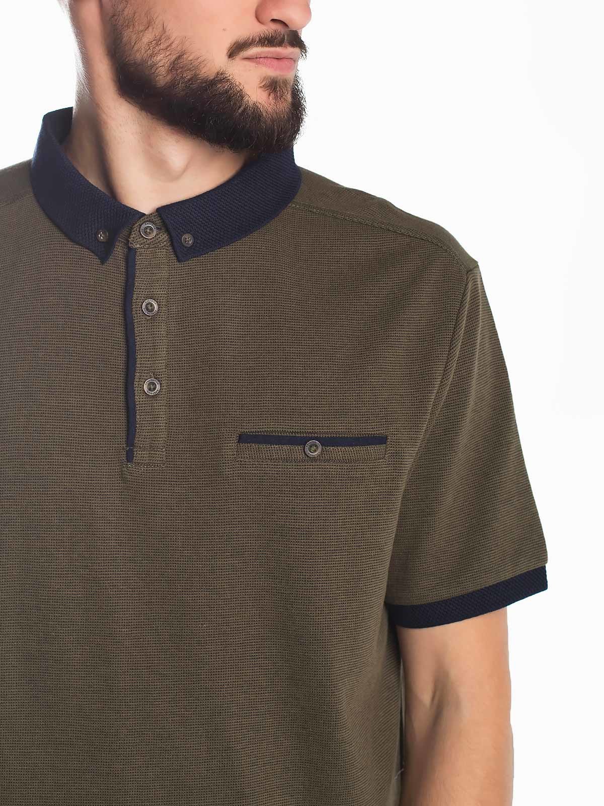 Polo manga curta para homem com bolso no peito botão. Polo em tecido trabalhado com gola colarinho e manga em tecido diferente. O modelo está a vestir tamanho L