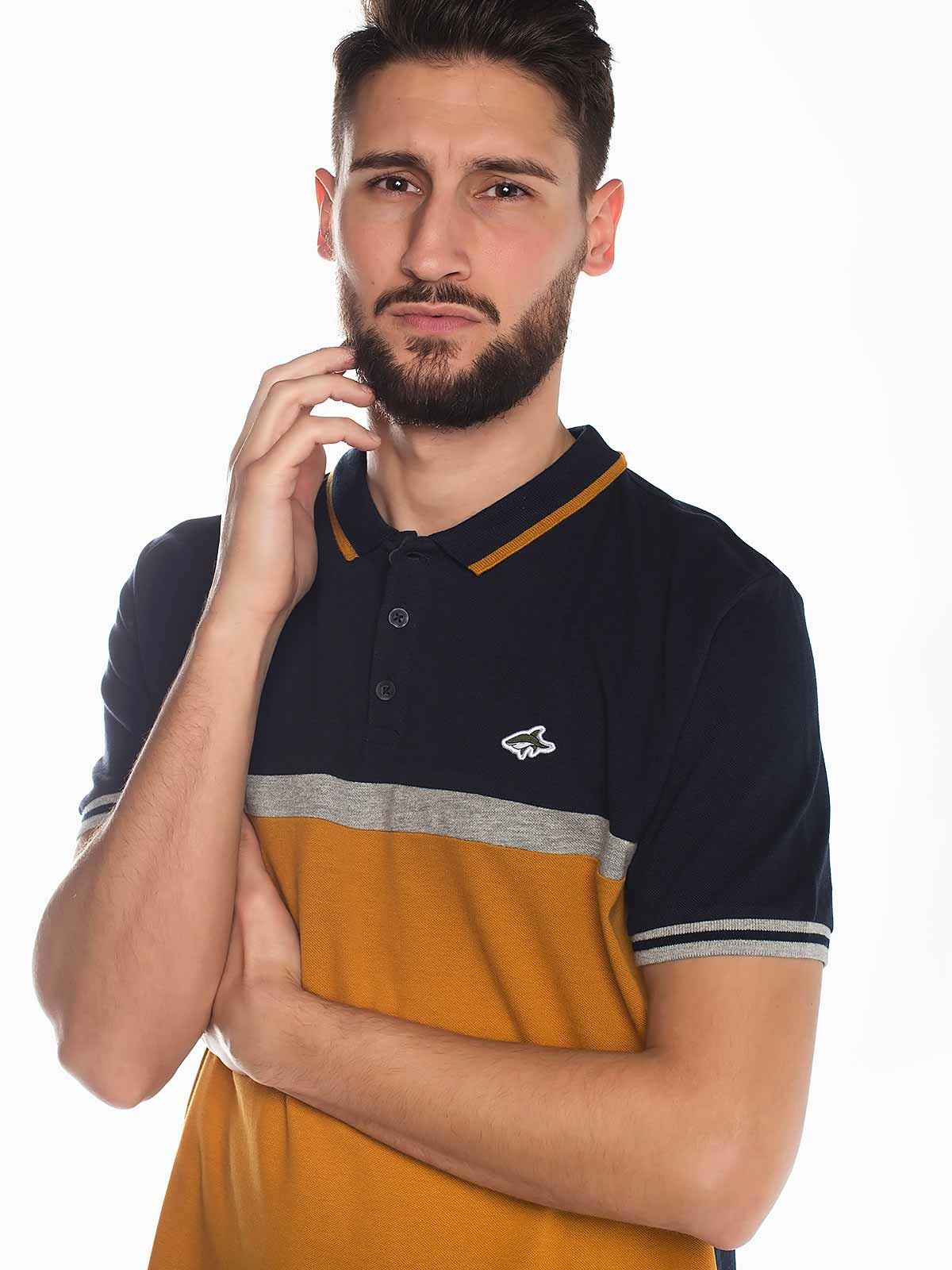 Polo manga curta para homem com encaixe de cores. Polo tecido confortável com bordado no peito. O modelo está a vestir tamanho L.