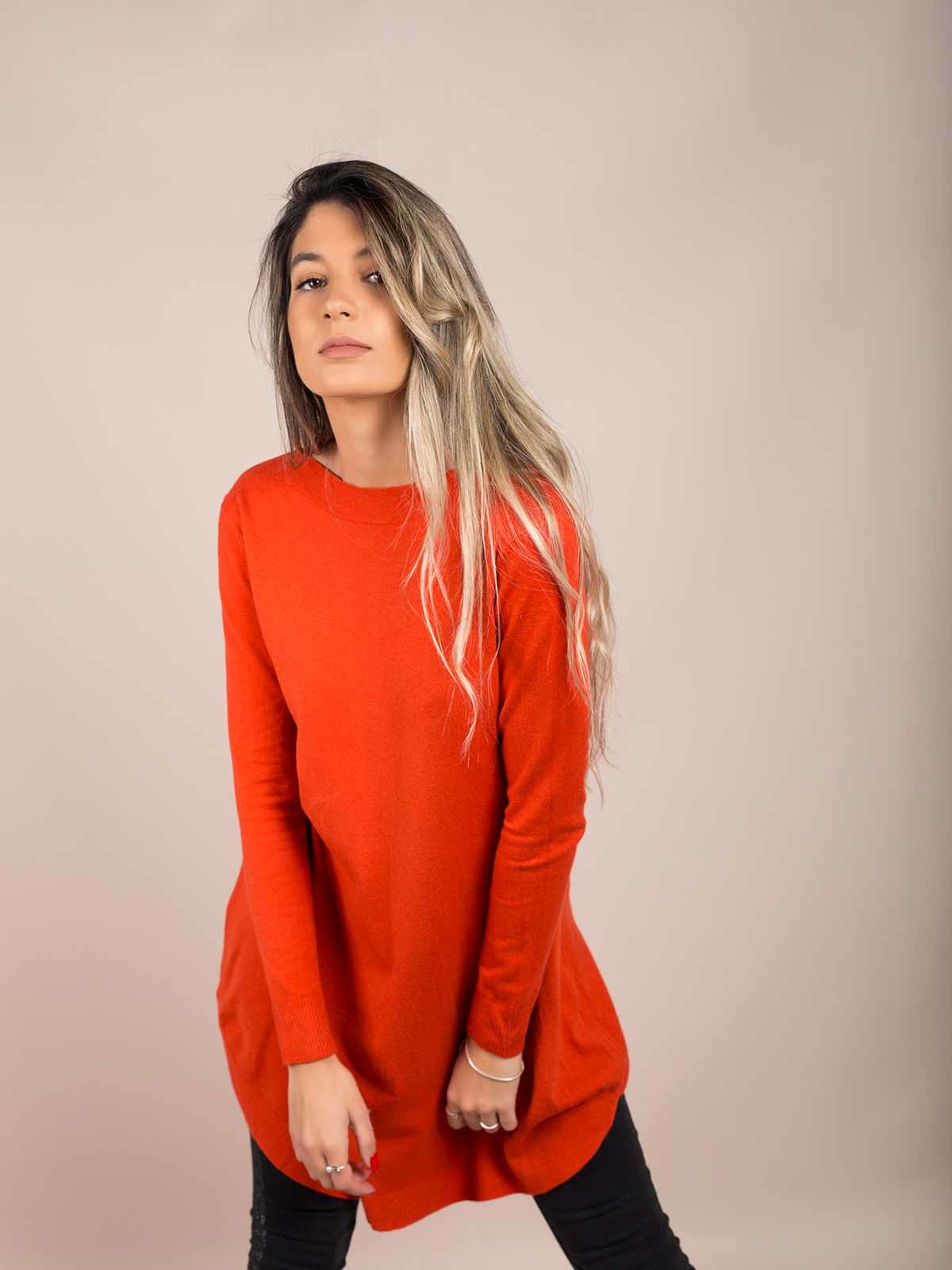 Túnica em malha manga comprida com decote em barco. A modelo está a vestir tamanho S/M