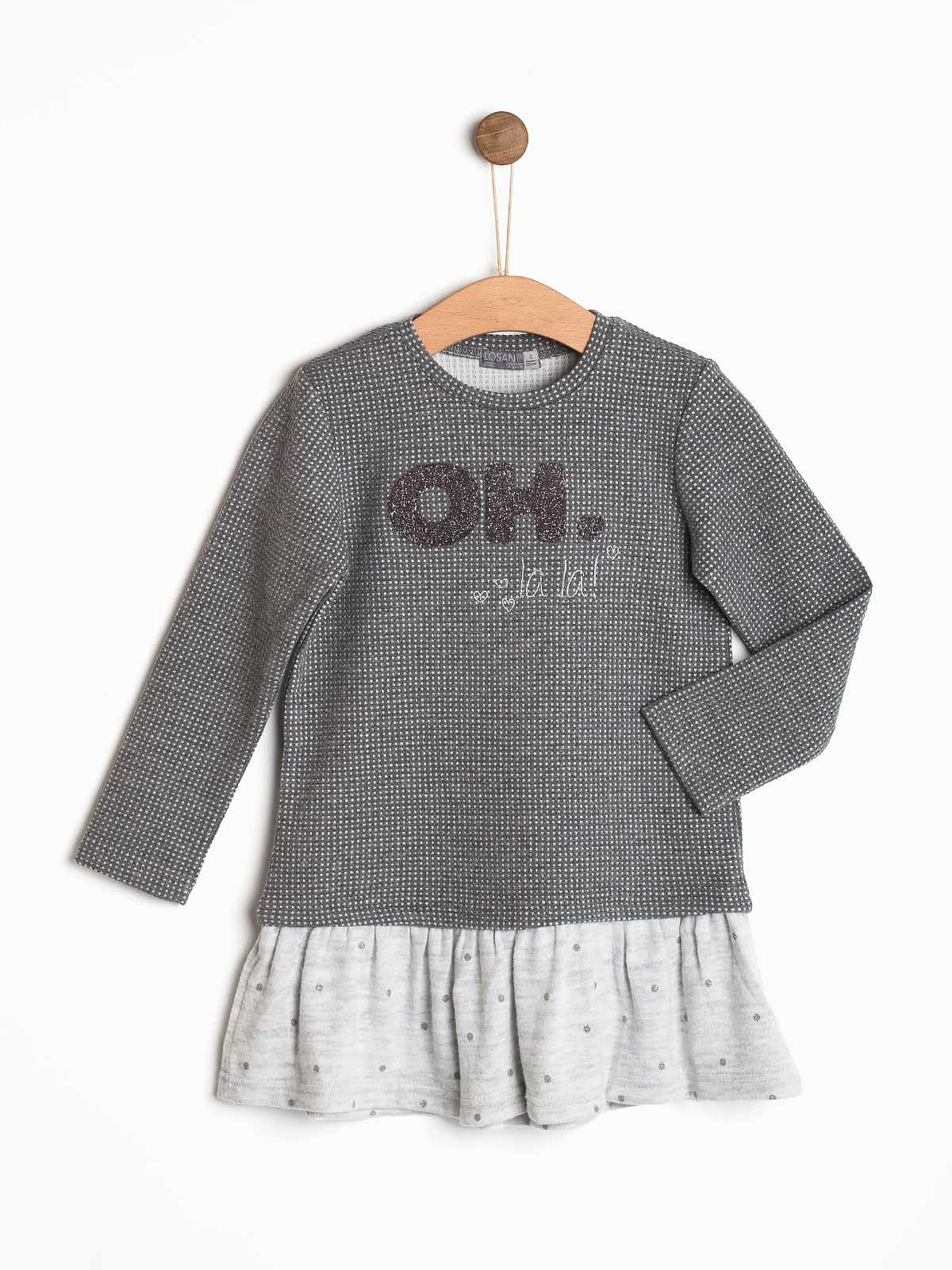 Vestido menina malha mesclada com encaixe de folho em baixo. Vestido de menina manga comprida decote redondo com estampado.