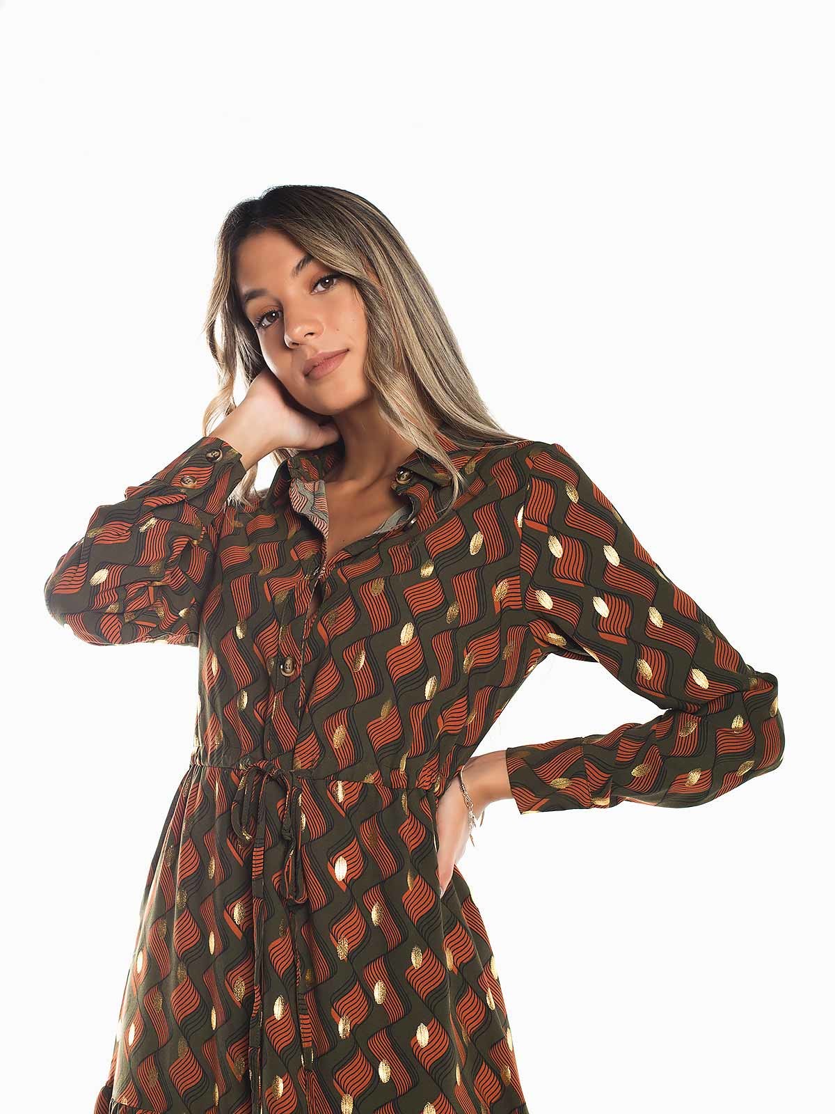 Vestido comprido estampado manga comprida com folho em baixo. Decote com gola e botões. Cinto elástico na cinta. Punhos com botões. A modelo está a vestir tamanho S