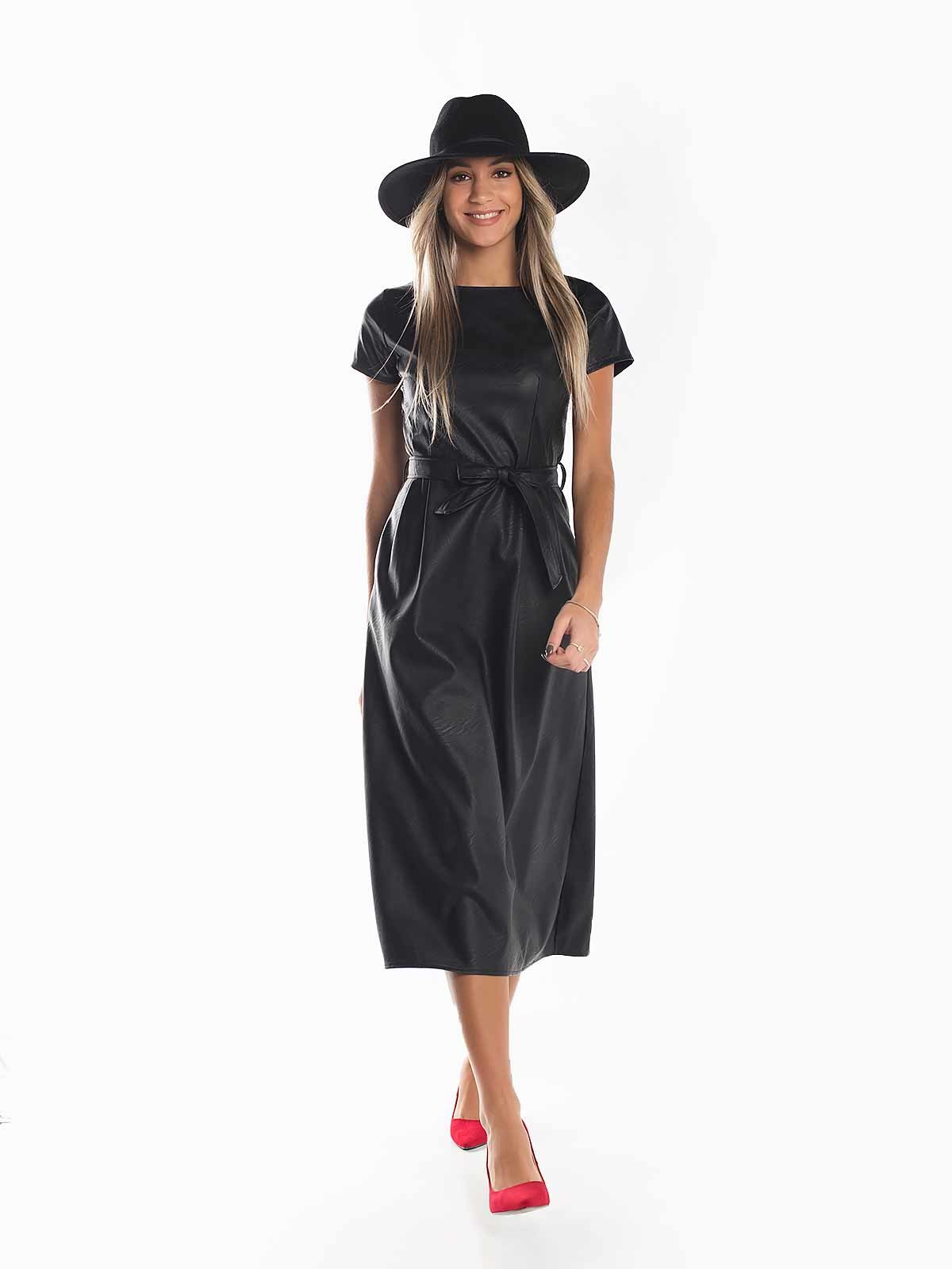 Vestido comprido de pele sintética para senhora. Vestido de manga curta decote redondo e laço em pele na cinta. A modelo está a vestir tamanho S