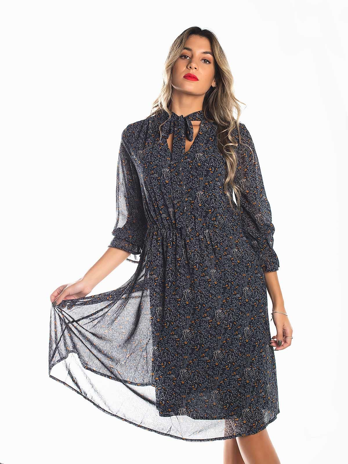 Vestido comprido estampado floral tecido fluido com forro. Vestido manga 3/4 decote em bico com laço. Cinto elástico.