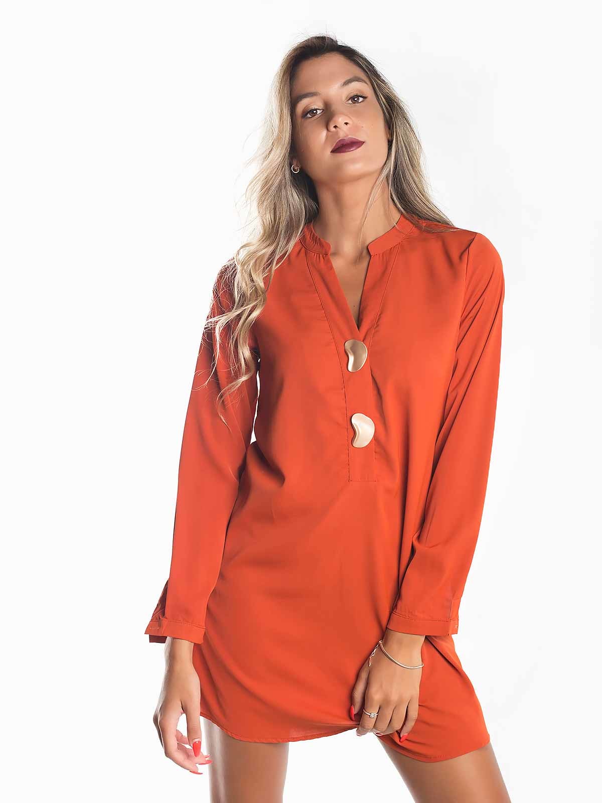 Vestido liso manga comprida com botões deformados no decote