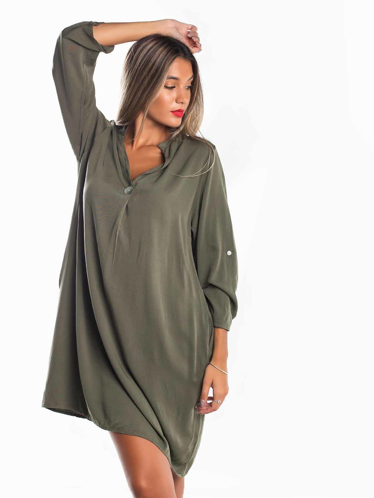 Vestido curto largo com bolsos de lado. Vestido curto de decote em bico com botão.