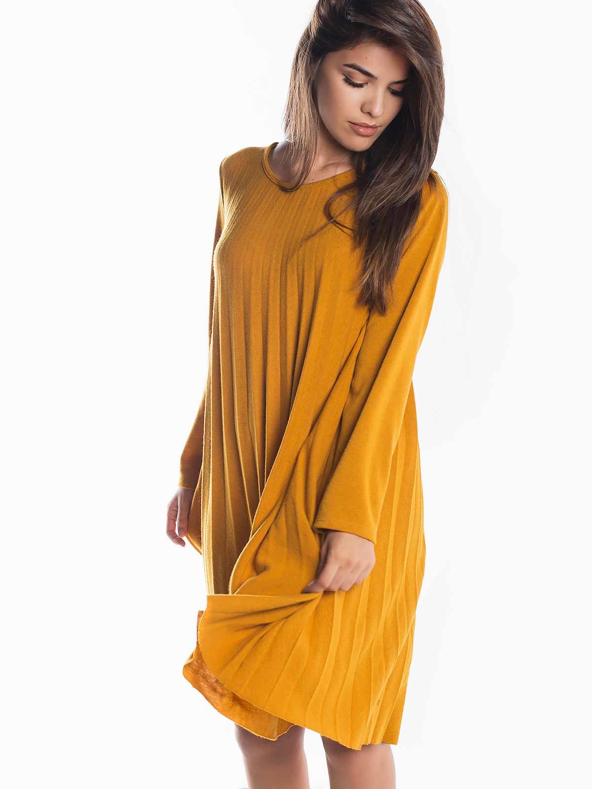 Vestido curto de malha plissada. Vestido de manga comprida decote redondo