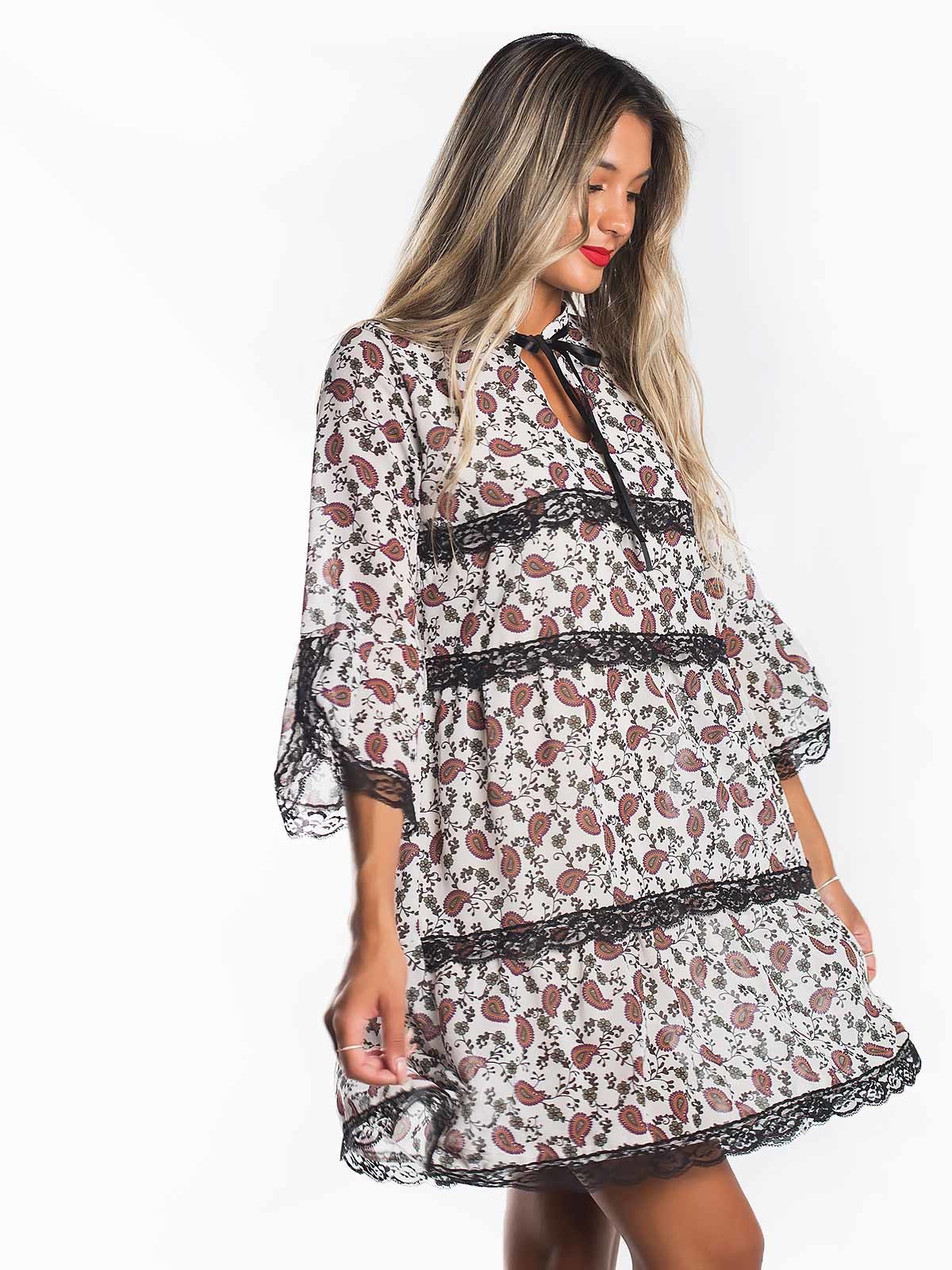Vestido curto estampado padrão com renda aplicada de efeito. Um vestido para um look fresco de charme. Vestido curto largo com manga 3/4.